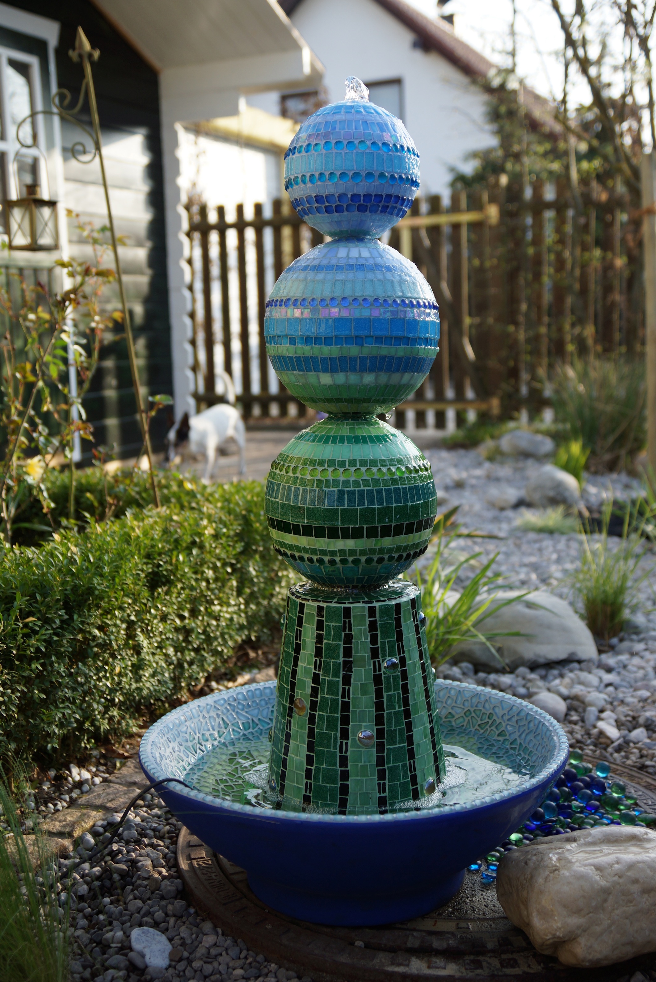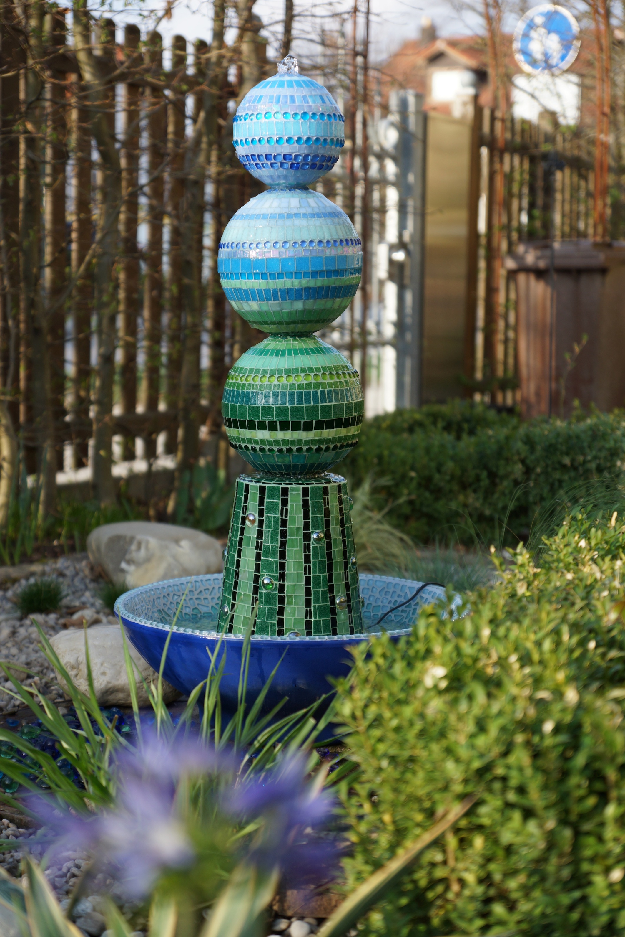 Vor dem ersten Testlauf mit der Pumpe und dem Wasser war ich schon sehr nervös, aber es hat gleich auf Anhieb gut geklappt – zur großen Freude der versammelten Mosaizisten und Mosaizistchen ertönte sanftes Geplätscher im Wintergarten: