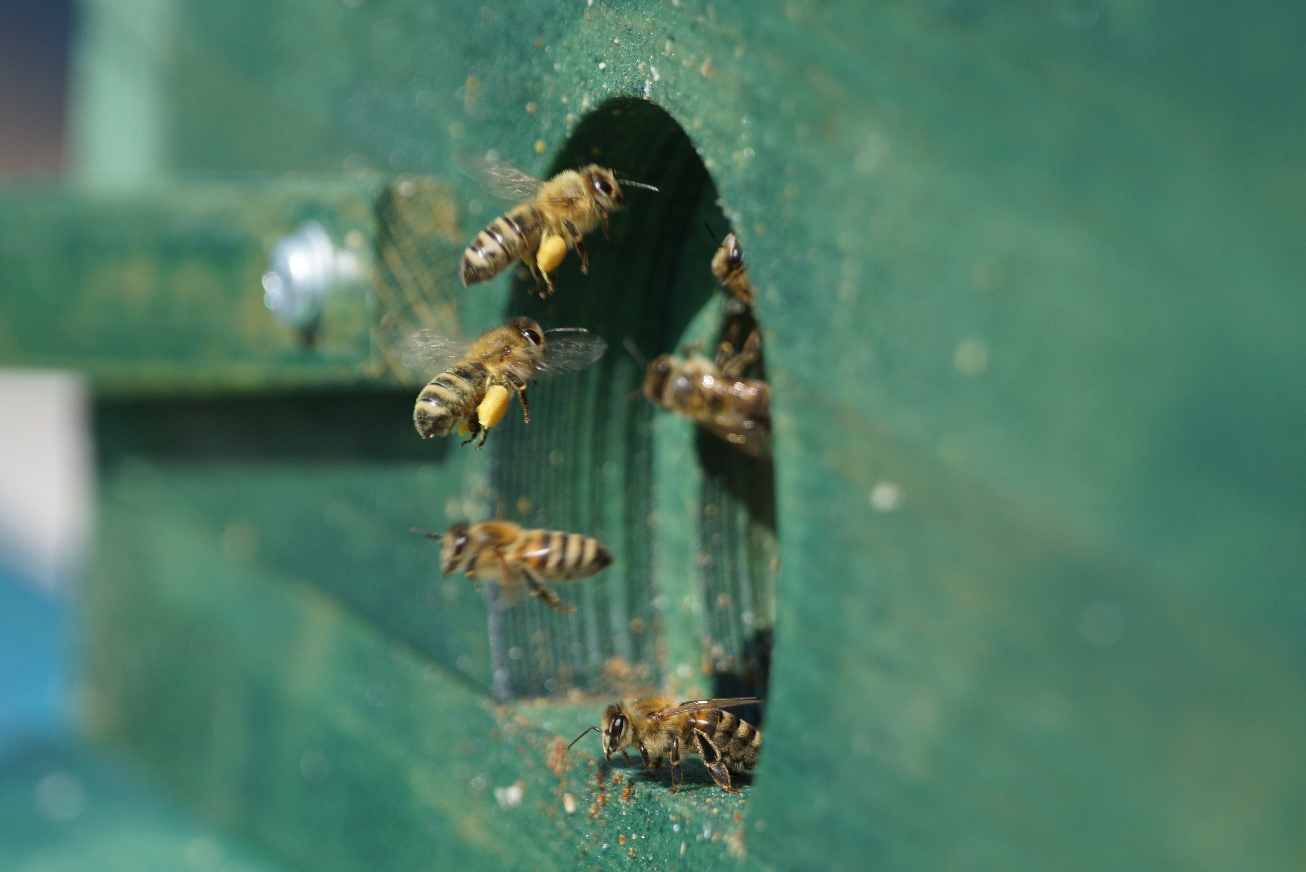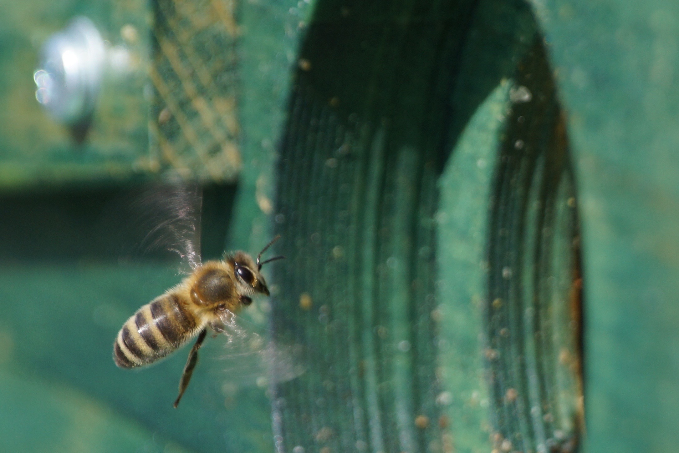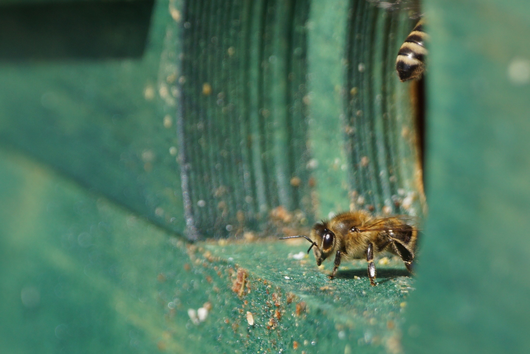Über das Wochenende musste ich meine Besuche bei den Bienen eher kurz halten, da unser Sohn am Sonntag Erstkommunion hatte und es so einiges vorzubereiten gab. Das anhaltend wunderbare Wetter haben allerdings auch unsere Damen auf der Garage gut genutzt. Der Flugverkehr war sehr emsig. Das ausgelaufene Futter war inzwischen feinsäuberlich aufgeschleckt worden. Das Rindenstück im Flugloch hatten die Bienen scheinbar irgendwie bearbeitet – es waren immer mehr Krümel rundherum zu sehen.