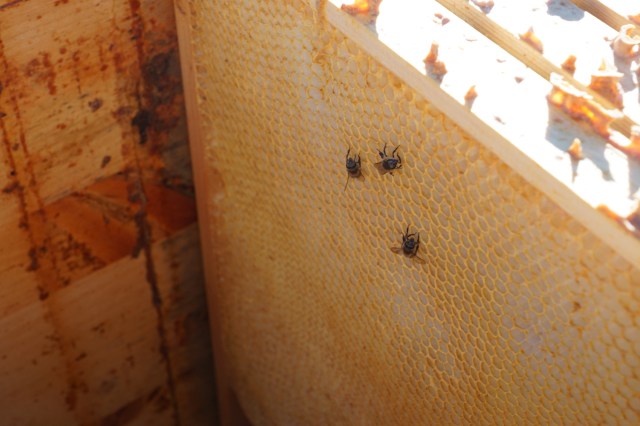 Sie waren also wohlauf und putzmunter, und waren gerade dabei den angesammelten Totenfall vor die Tür zu werfen. Und dann der Blick auf die blaue Beute – Totenstille! Kein Flugverkehr, niemand krabbelte am Flugloch und nicht eine einzige tote Biene war rausgeworfen worden. Mir war relativ schnell klar, dass das Volk wohl nicht mehr existierte. 😦