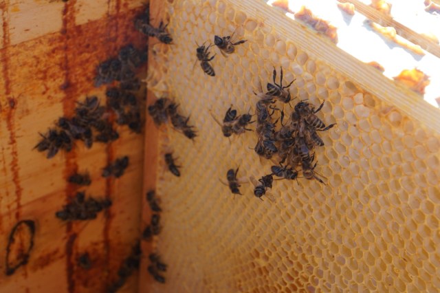 Auf den ersten, fluglochfernen Waben eine Handvoll tote Bienen und auch bei offener Beute nichts zu hören. Und dann krabbelten mir auf einmal ein paar einzelne Bienen entgegen. Weiter Richtung Flugloch fiel mir dann eine ganze Gebirgskette vom Herzen! Hurra, das Volk war doch nicht tot!!!