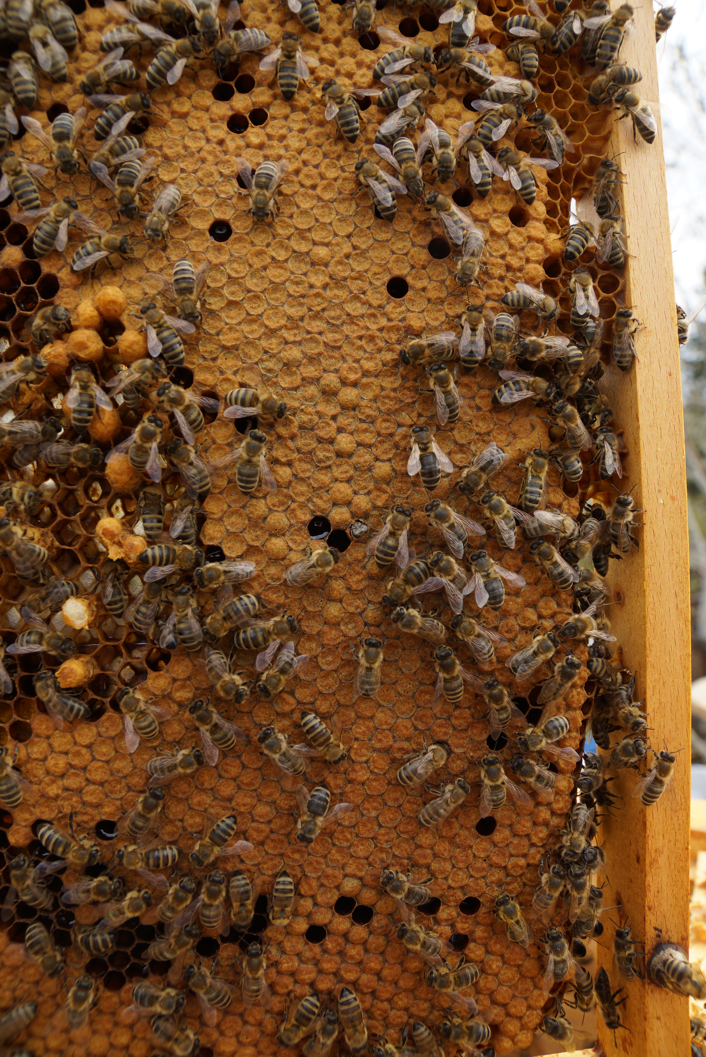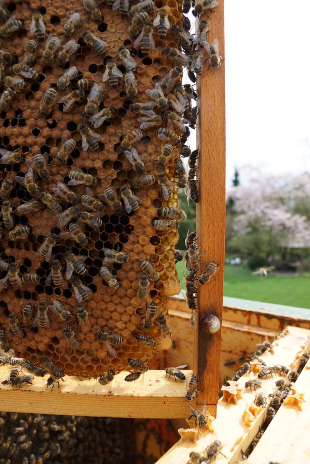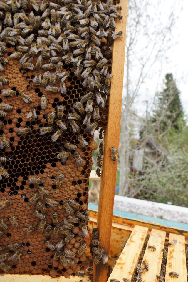 Die ersten Vorbereitungen auf die Schwarmzeit sind zu erkennen – in allen drei Völkern werden „Spielnäpfchen“ gebaut. Das sind diese schüsselförmigen Zellen am Rand der Wabe, die dann bei Bedarf zu Weiselzellen weitergebaut werden, in denen dann eine neue Königin heranwächst. Ab jetzt heißt es also regelmäßig kontrollieren!