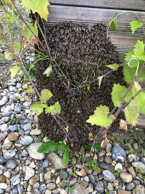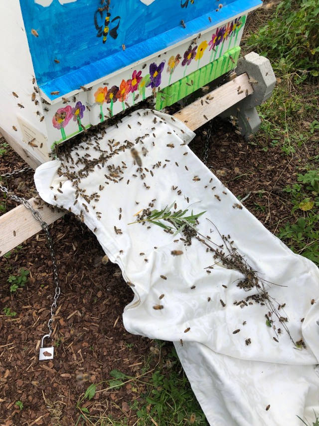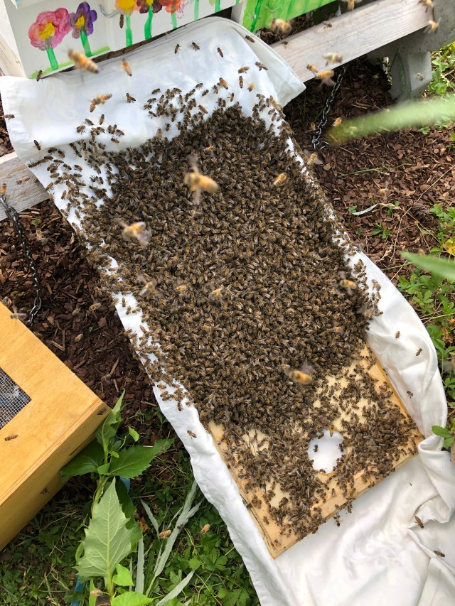 Vom ersten Schwarm hingen immer noch recht viele Bienen außen am Gitter, daher beschloss ich kurzerhand nicht erst alle mühsam hineinzubugsieren, sondern sie gleich so zu uns rüber zu tragen und in die leer stehende gelbe Beute einlaufen zu lassen. Das musste natürlich wegen des Wetters schnell, schnell gehen.