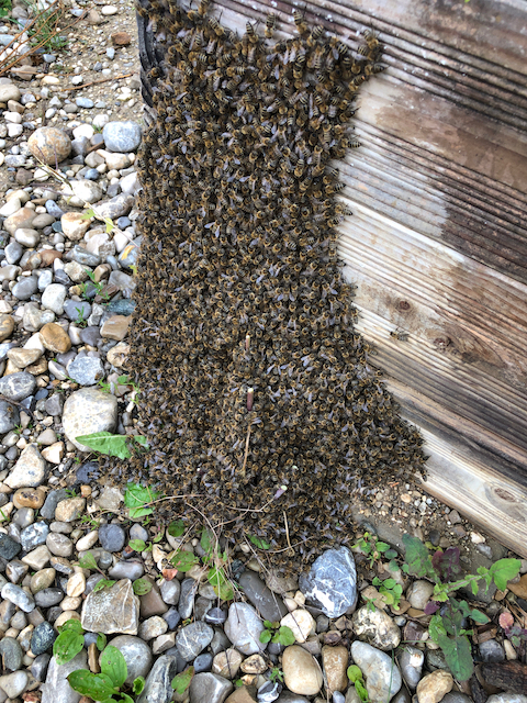Am 24.Mai war es dann nach einer gefühlten Ewigkeit des Wartens und Entsetzens über das erneut kalte, nasse, windige Wetter. Mein Bauchgefühlt lag richtig, das stärkste Volk aus der Pollenbeute startete trotz eher mäßigen Wetters mit ordentlichem Lärm um kurz nach eins unsere Schwarmsaison!