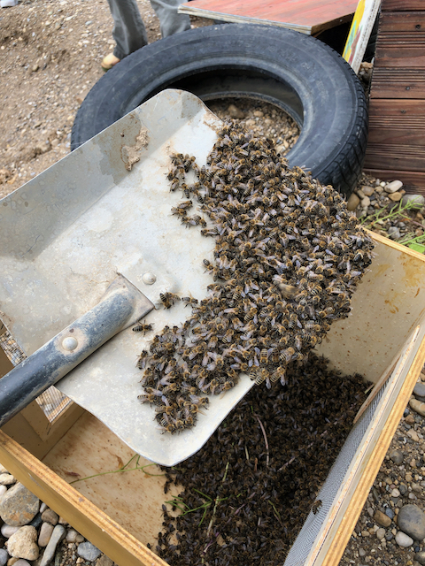Zur flugs gekäfigten Königin packte ich noch Arbeiterinnen in einen improvisierten Transportkarton mit Lüftungsgitter. Es wartete nämlich jemand schon sehnsüchtig auf einen Schwarm, auch wenn er eher auf der kleinen Seite war. Ich hätte bei diesem Volk nicht so ganz mit einem Schwarm gerechnet, denn aus den Nähten platzten sie nicht gerade. Wie auch immer, nun durften sie ins schöne Oberland zu Sonja umziehen.