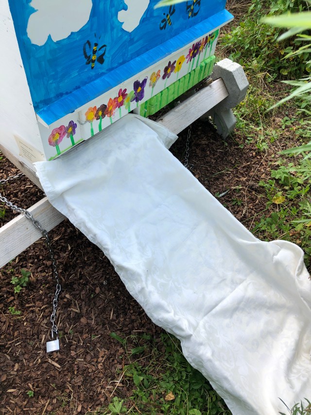 Sicherheitshalber setzten wir sie auch in eine Schwarmkiste, die dann wegen des erneut aufziehenden Regens etwas geschützt werden musste. Wie bereits erwartet, wurde die Kiste immer leerer und leerer. Da war wohl keine Königin mit drin gewesen. Die spannende Frage war nur – wo steckte Corona I.? Hatten sich die beiden Schwärme vereinigt? War der zweite Schwarm wieder zurück nach Hause?