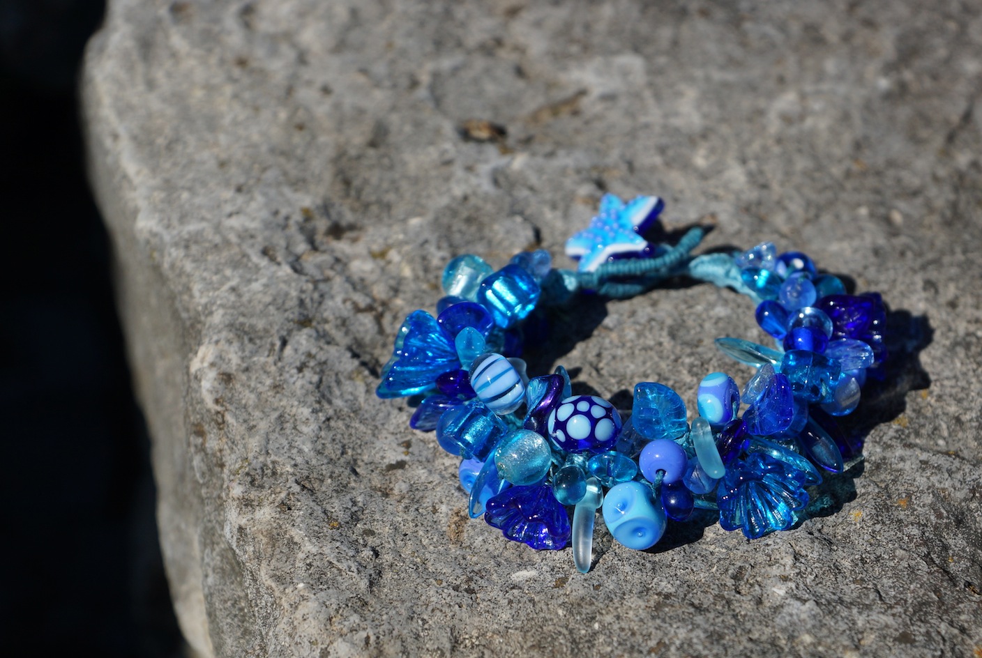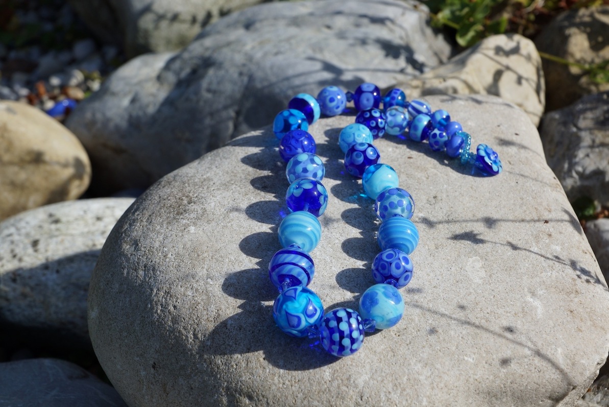 Die grüne habe ich zuerst angefertigt. Grüntöne gibt es ja wirklich reichlich, und bis auf ein paar wenige Ausnahmen waren die Farben auch alle recht leicht zu verarbeiten. Mit dem opaken Grasgrün von Effetre stehe ich regelrecht auf Kriegsfuß – das fliegt mir schon um die Ohren, wenn ich es nur schief anschaue. Gerade wenn ich dann schon mehrere Perlen auf einem Dorn waren, grenzte das eher an Actionsport!