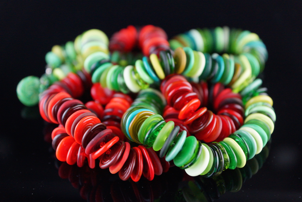 Auf einem Offline-Treffen des Glasperlenforums durfte ich vor Kurzem eine ganze Reihe wunderschöner Ketten aus Scheibenperlen bewundern. Auch wenn ich ein wenig Respekt vor der schieren Anzahl der nötigen Perlen für solch eine Kette hatte, habe ich mich dann doch ran gewagt. Entstanden sind dann gleich zwei Ketten als Geburtstagsgeschenke für meine Mama und Schwiegermama – in den jeweiligen Lieblingsfarben rot und grün…