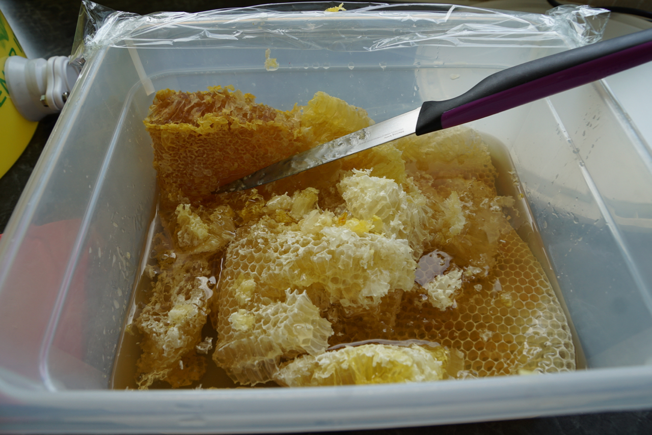 Bei den roten habe ich nur das letzte Rähmchen am Schied angeschaut, aber das wird jetzt nur noch sehr langsam ausgebaut, somit haben sie kein neues gebraucht. Dafür haben sie in den leeren Raum unsere gesammelten noch ungespülten Honiggläser zum Ausschlecken hineingestellt bekommen – natürlich nur vom eigenen Honig!