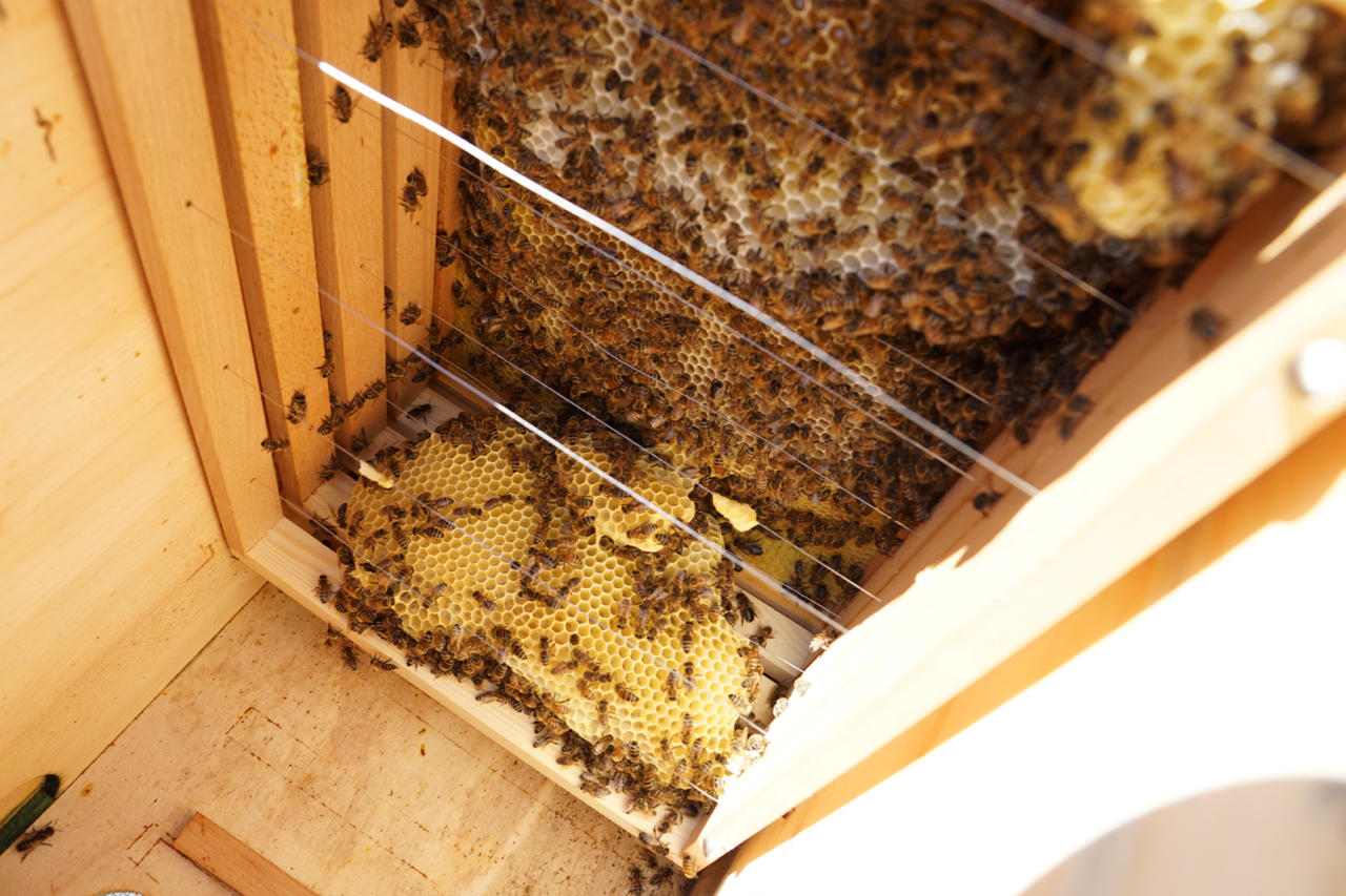 Bei den blauen habe ich auch kurz in den Honigraum geschaut, hier wird weiter gebaut und eingetragen – sehr schön. Ich wollte auch noch durch die Wartungsklappe schauen, ob unten wieder Wildbau entstanden ist, aber der Raum unter den Rähmchen ist komplett mit Bienen zugestopft… Ich hatte leider kein Handy zum Fotografieren dabei, aber voller geht es nicht mehr!