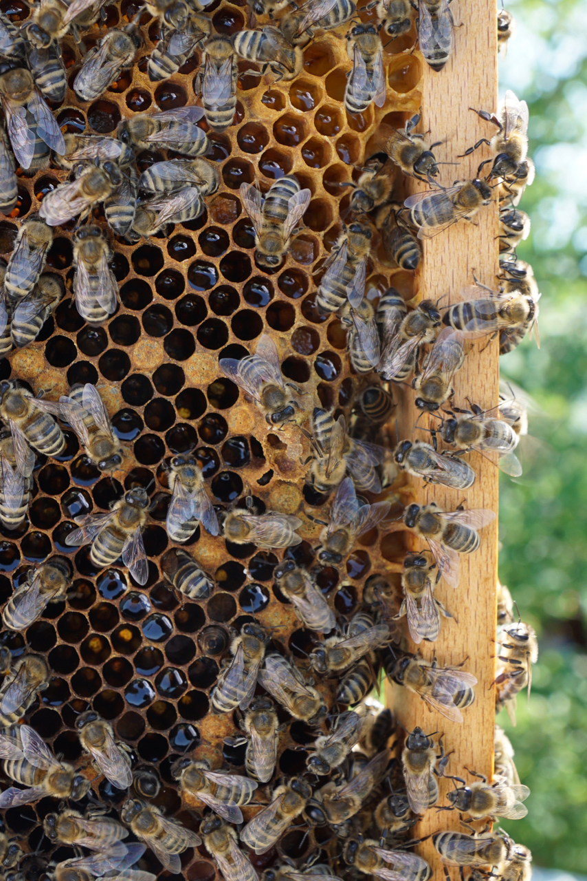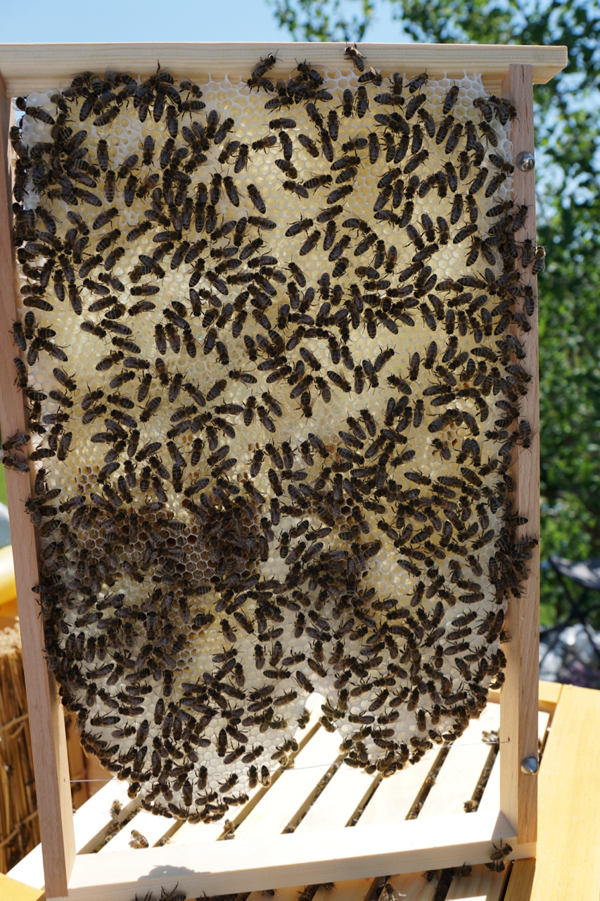 Fangen wir aber mal beim gelben Volk an! Hier ist soweit alles in Ordnung, ich habe gestern eine Durchsicht gemacht, es ist genug Honig drin, so dass ich nächste oder übernächste Woche etwas ernten kann. Ich habe die reinen Honigwaben schon in Richtung Schied umgehängt (sie hatten 2 reine Vorratswaben an Position 2 und 3, wo ich mit Leerrähmchen erweitert hatte). So muss ich dann bei der Ernte nicht wieder alles verschieben und störe so wenig wie möglich.