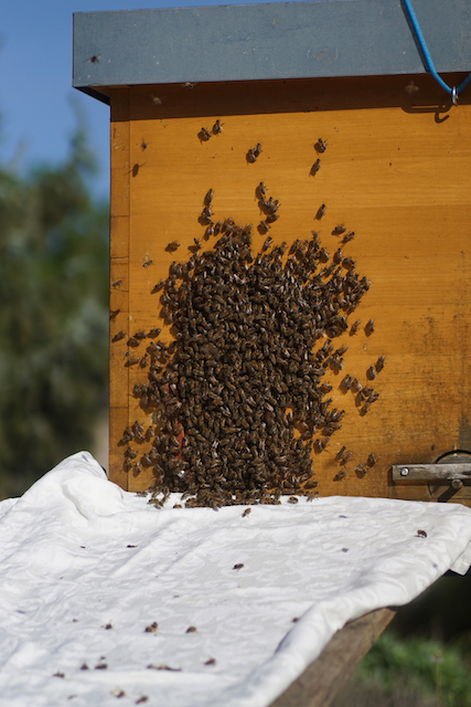 Am nächsten Morgen hingen immer noch sehr viele Bienen außen an der Beutenwand.