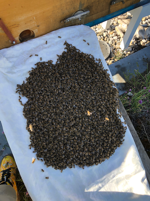 Was mir dann etwas Sorge machte, war zum einen die dicke Traube, die innen hinter dem Flugloch hing, und vor allem die Kundschafterin, die sehr emsig auf der noch vorhandenen Traube im Flugloch tänzelte. Gefiel ihnen das neue Zuhause etwa nicht? Waren sie noch auf der Suche nach einer andere Bleibe? Das Risiko eines erneuten Auszugs wollte ich natürlich nicht eingehen. Also wurden die außen ansitzenden Bienen kurzer Hand mit einem weichen Teigspachtel ins Flugloch bugsiert und selbiges anschließend verschlossen. Ein kurzer Blick oben unter das Wachstuch ließ erkennen, dass die Traube noch nicht schön nach oben gestiegen war, sondern innen hinter dem Flugloch hing. Das hatte ich so noch nicht gehabt und ich hielt das auch für kein gutes Zeichen! Um sie nach oben zu locken, schmierte ich ein paar Esslöffel von ihrem eigenen Honig oben auf die Rähmchen drauf und begann auch gleich mit der Fütterung über einen Fluglochfütterer unter dem Trennschied hindurch um sie zum Bauen anzuregen. Wegen des warmen Wetters wurde die Beute auch noch mit einem Schirm schattiert, da ich ja Ausgangssperre für die Bienen verhängt hatte.
