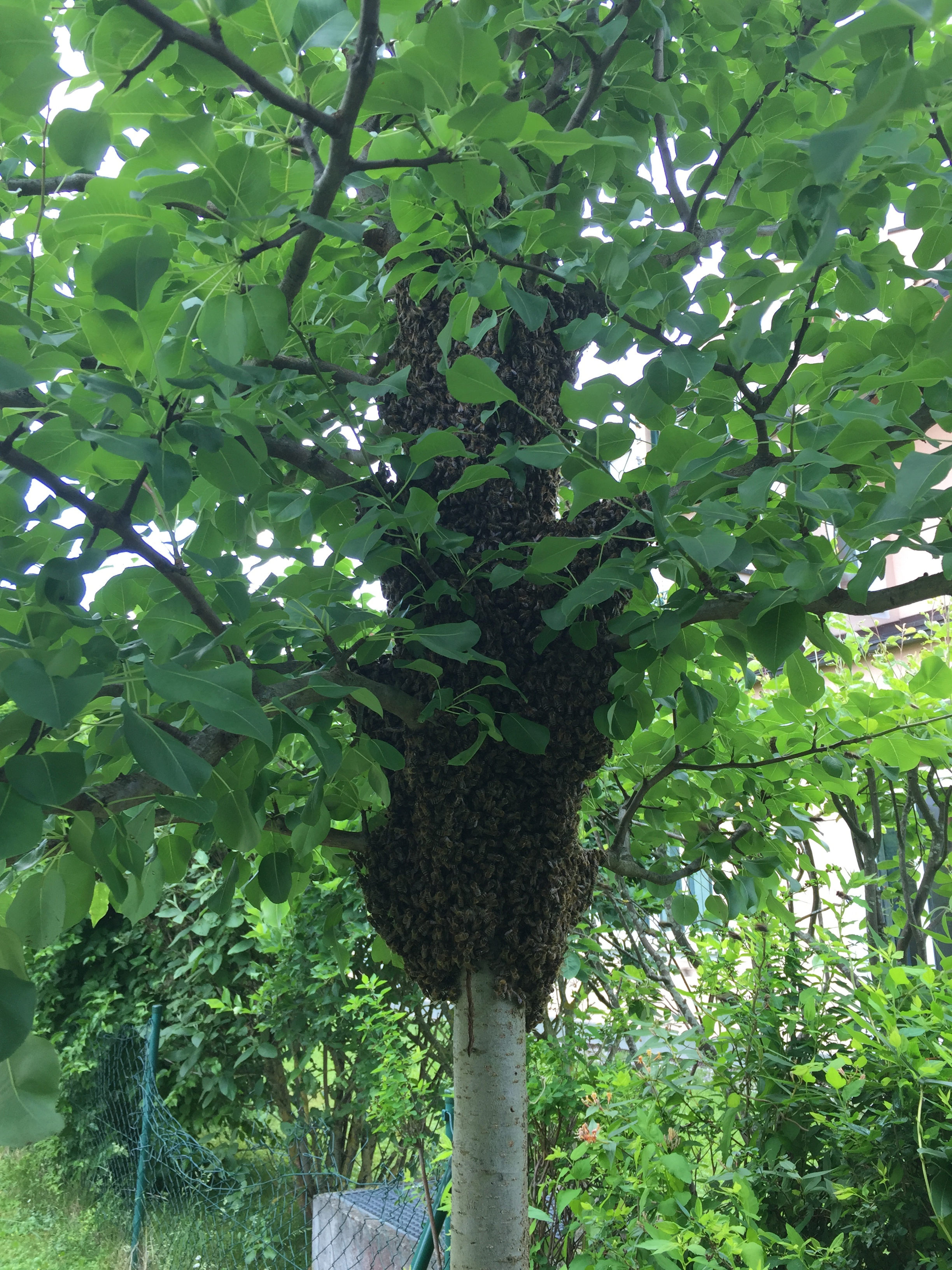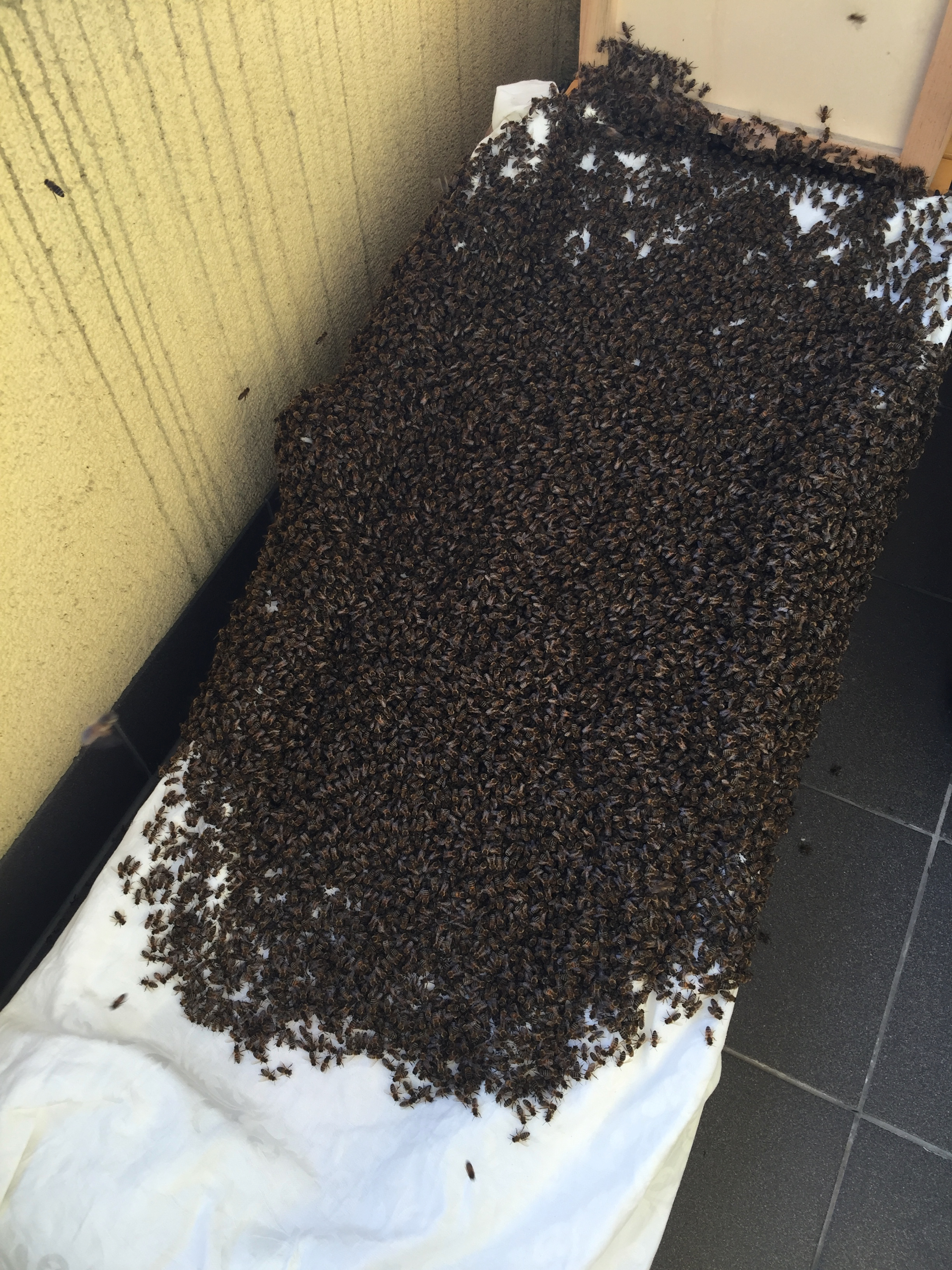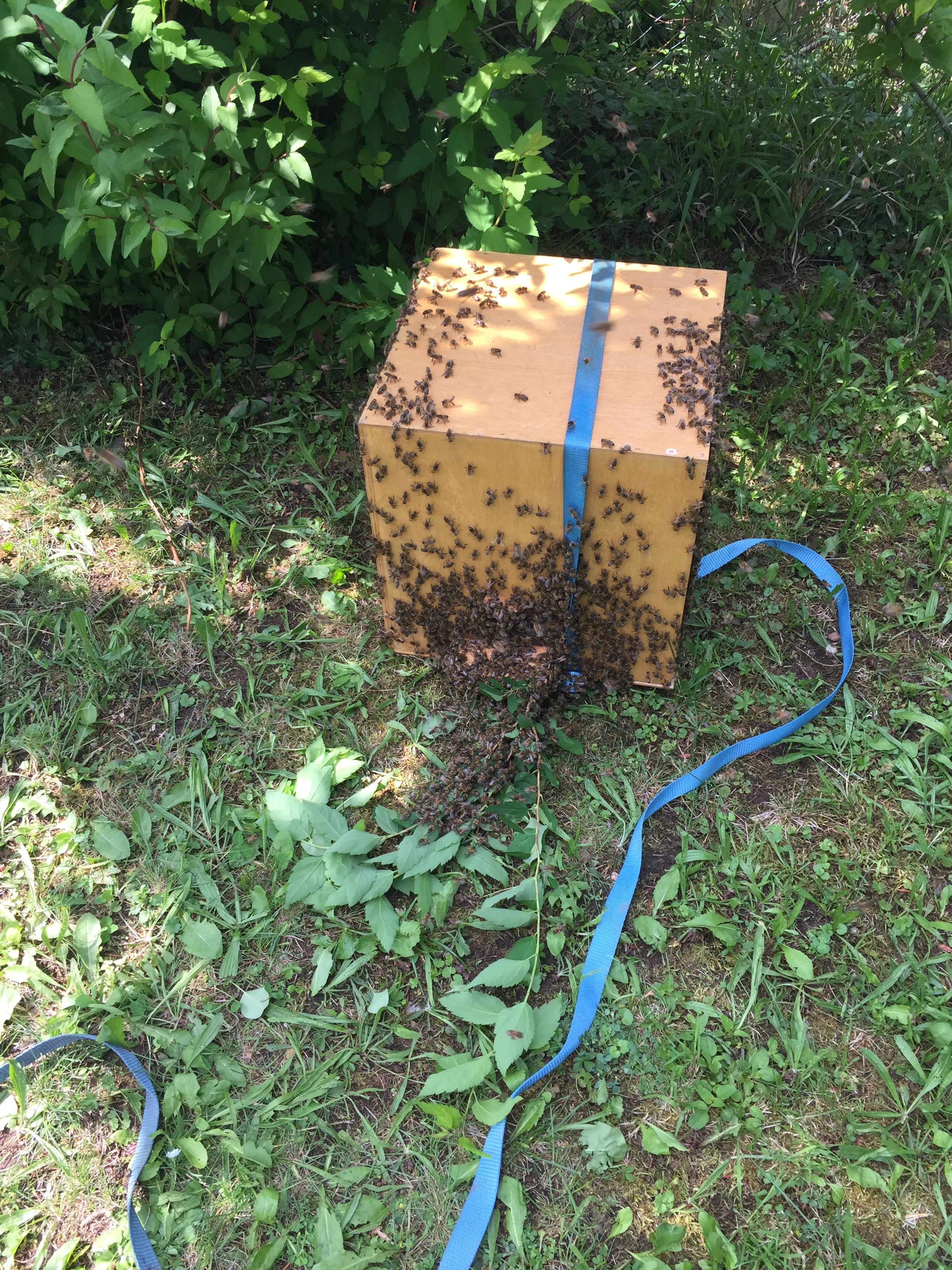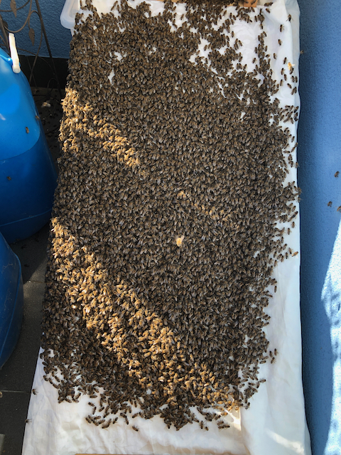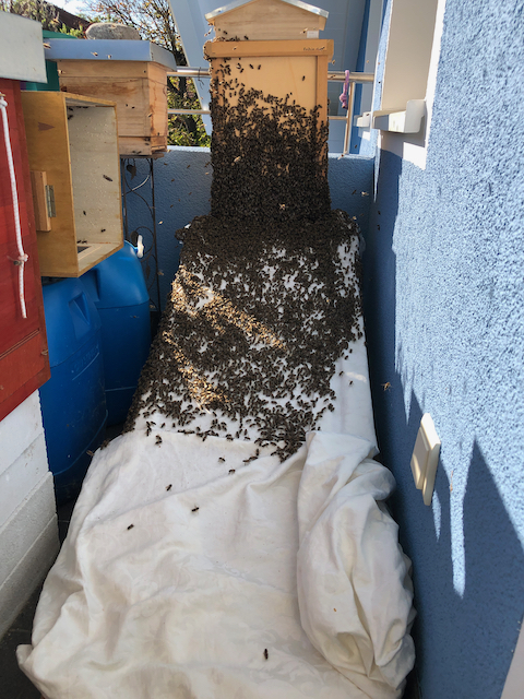 Es waren wirklich viele Bienen! Der Großteil des Einzuges verlief sehr schnell, dann gab es trotz des breiten Fluglochs mal wieder einen ordentlichen Stau.