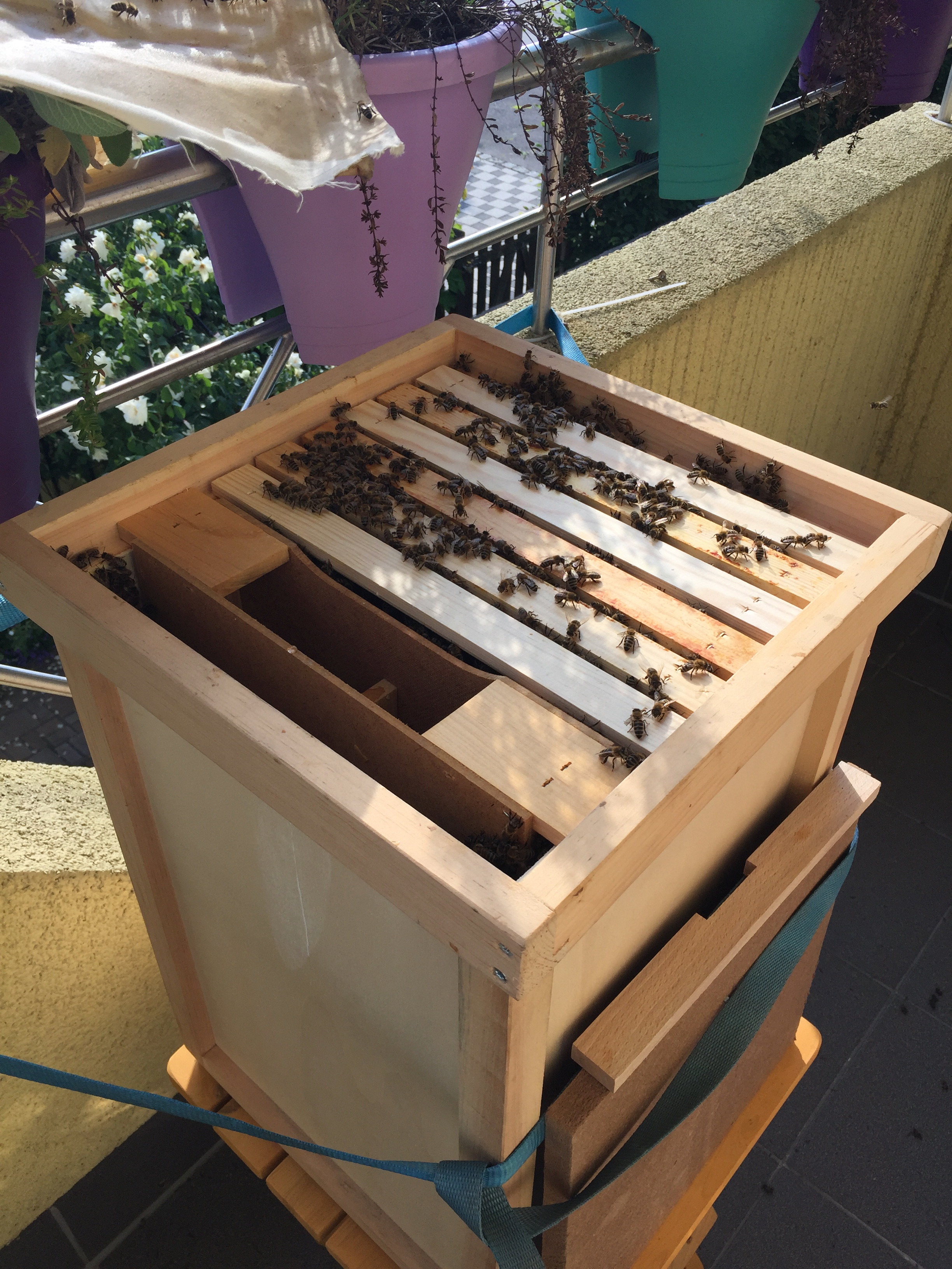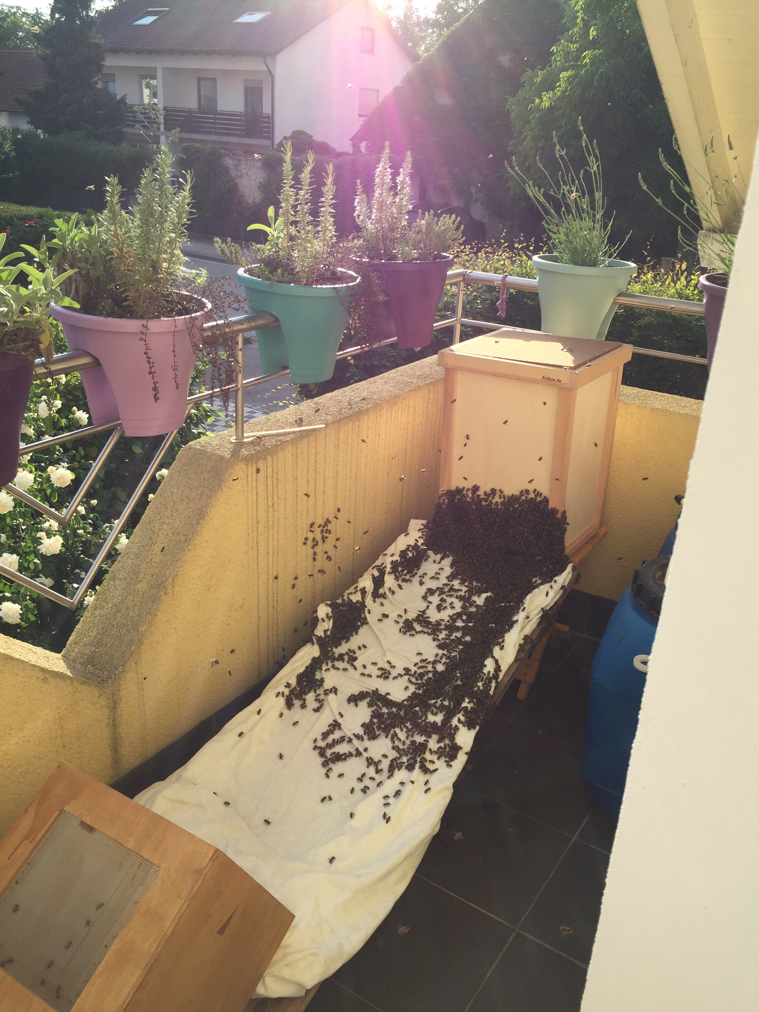 Zum Imkern geht es gerade noch, das Einlaufen lassen war aber schon eine logistische Herausforderung! Hier nur ein paar Bilder vom gestrigen Einlaufen des Megaschwarms. Da ich keine leerstehende Beute hatte, musste die Wabentransportkiste mal wieder herhalten, um dem Schwarm ein provisorisches Zuhause zu bieten, bis die neue Beute angekommen ist. Ich habe die Kiste komplett mit Rähmchen gefüllt (also 8 Stück), wobei ich sogar noch ein paar alte Waben einschmelzen musste, um wenigstens noch sechs meiner bevorzugten Mellifera-Rähmchen zu verwenden. Zwei sind jetzt die senkrecht gedrahteten Janisch-Rähmchen, die aber immerhin seit dem Upgrade auf größere Abstandshalter den Beespace einhalten. Mehr hatte ich tatsächlich nicht mehr, aber auch gleich einmal nachbestellt. Auf engstem Raum wurde dann eine Erhöhung für die Kiste und eine Rampe improvisiert.