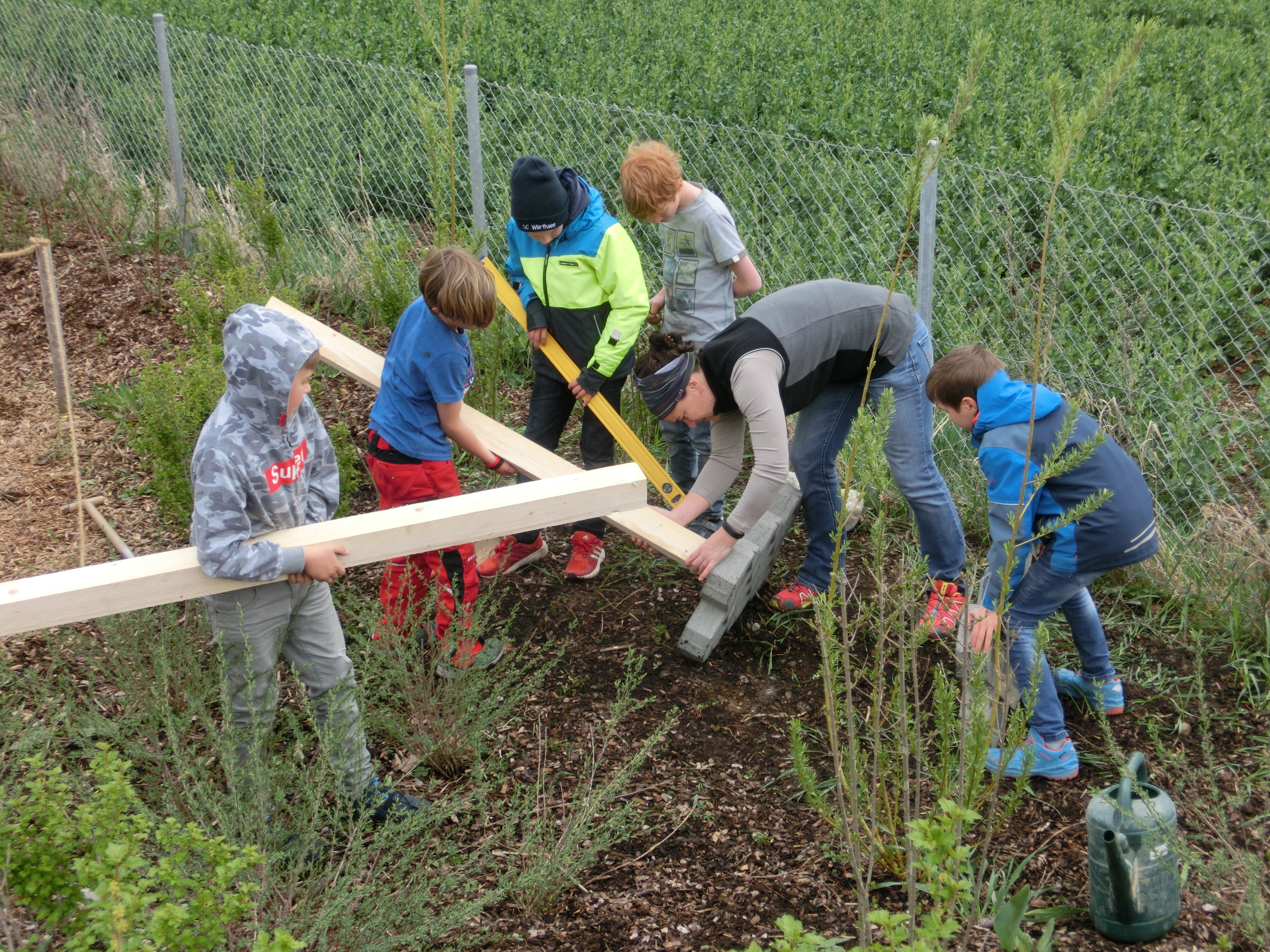 Es mussten auch ein paar Büsche versetzt werden und ein Beutenbock aus Kanthölzern und Rasengittersteinen gebaut und ausgerichtet werden. Ein paar Silphien haben wir auch noch um die Beute gepflanzt. Ich war wirklich begeistert, wie gut und selbständig sich die „Bienenkinder“ organisiert haben.