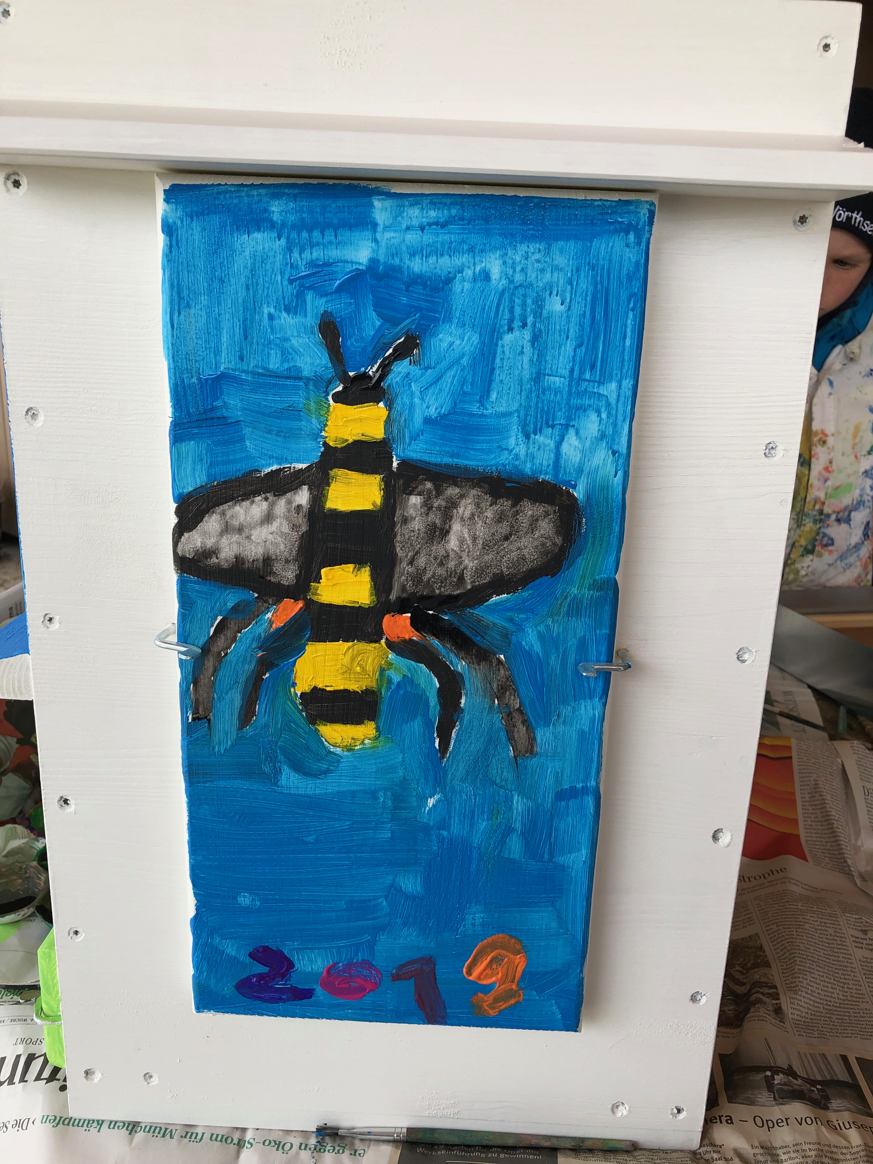 Da das Projekt so gut bei den Kindern ankam, beschlossen die Pädagogin und ich mit Einverständnis der Schulleitung, dass nun doch schon heuer ein Volk in der Schule einziehen und das Projekt verlängert werden sollte. Vereinbart wurde, dass ich Beute und Schwarm stellen würde, und die zukünftigen Honigernten geteilt werden sollten. Da ich mit den Einraumbeuten selbst sehr gut zurecht kam und sie auch für sehr bienenfreundlich empfinde, sollte es auch wieder eine Einraumbeute werden. Damit die Kinder hin und wieder einen „Einblick“ in die Entwicklung des Volks erhalten können, ohne dass die Bienen dauernd gestört werden, entschied ich mich für eine Window-ERB von der Firma Janisch. Dank der super schnellen Lieferung trotz Hochsaison und kurzer Vorlaufzeit kam die Beute gerade rechtzeitig bei mir an, so dass ich sie zweimal grundieren konnte, und den Kindern als Überraschung zum letzten Projekttag mitbringen konnte. Die Kids haben sie dann am letzten Tag noch bemalt und wir haben gemeinsam einen geeigneten Standort im Garten ausgewählt und vorbereitet.