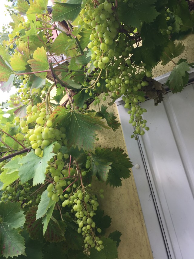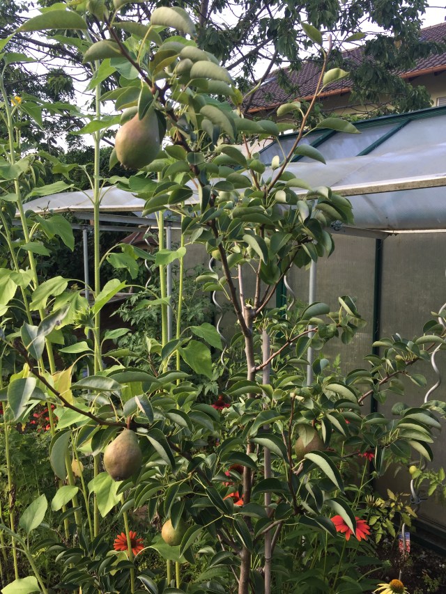 Die Last war zu schwer für den mickrigen Stamm, und er ist umgeknickt… 😦 Ausgerechnet Tobis Lieblingssorte! Inzwischen ist schon ein Ersatz gepflanzt – leider ohne Beeren dran…). Und die restlichen Ernteaussichten lassen uns den Verlust auch schnell vergessen… (Und ich denke hoffentlich nächstes Jahr daran, sie besser anzubinden!)