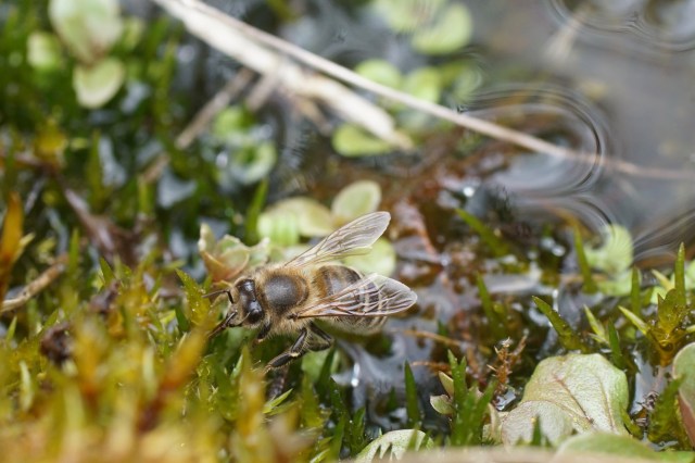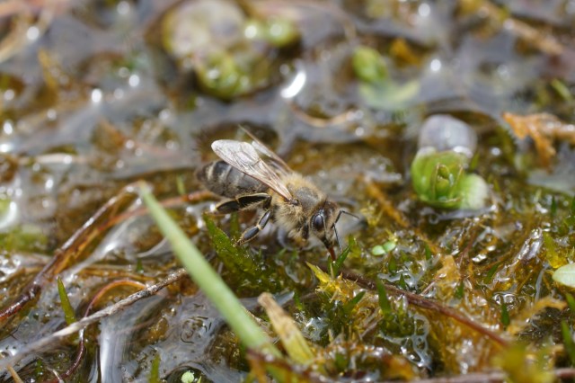 Da so viel auf einmal blüht, bemerkt man im Garten gar nicht, dass wir selbst Bienenvölker haben, weil sich die Sammlerinnen überall verteilen. Auch in den Nachbargärten stehen sehr viele Obst und Zierobstbäume. Wo man unsere Bienen aber in großer Anzahl antrifft, ist am Teich. Hier sammeln sie am Ufer im nassen Moos Wasser, das für die Aufzucht der Brut und zur Klimatisierung des Stocks benötigt wird: