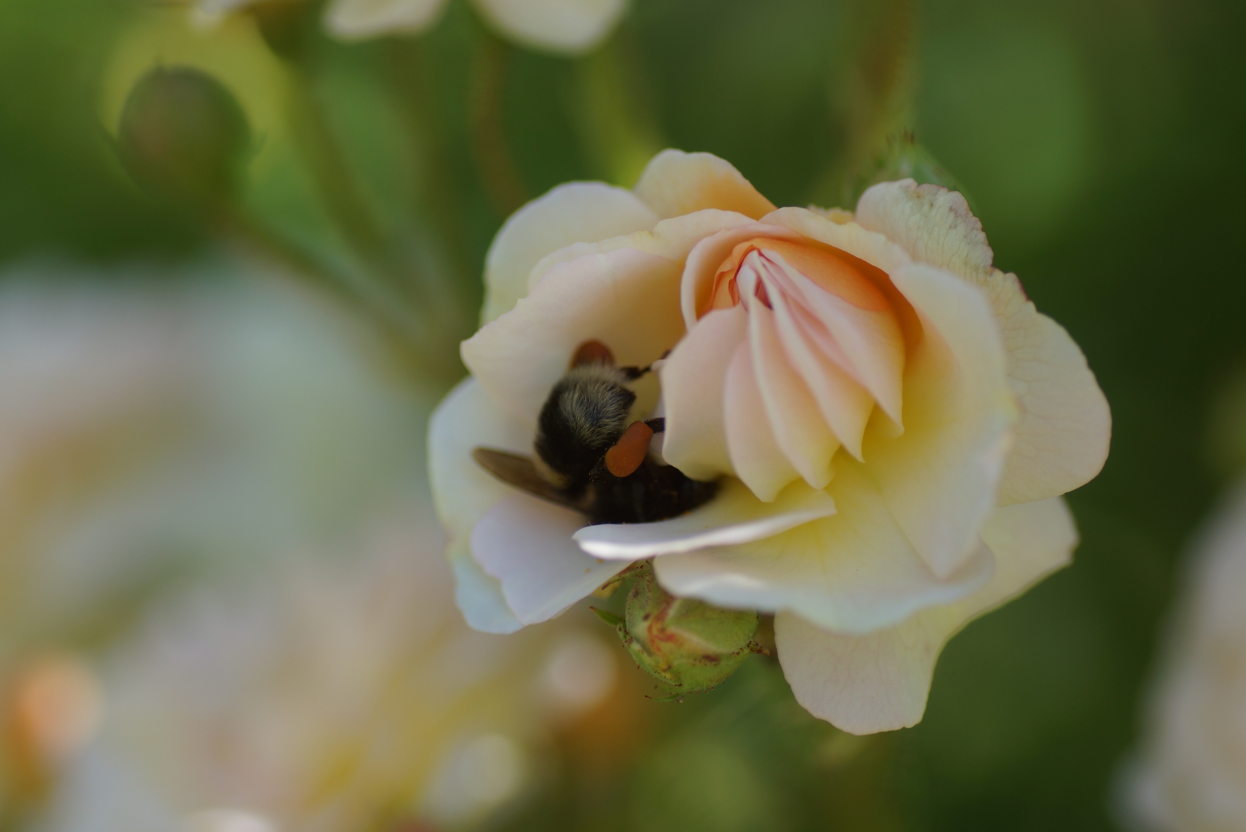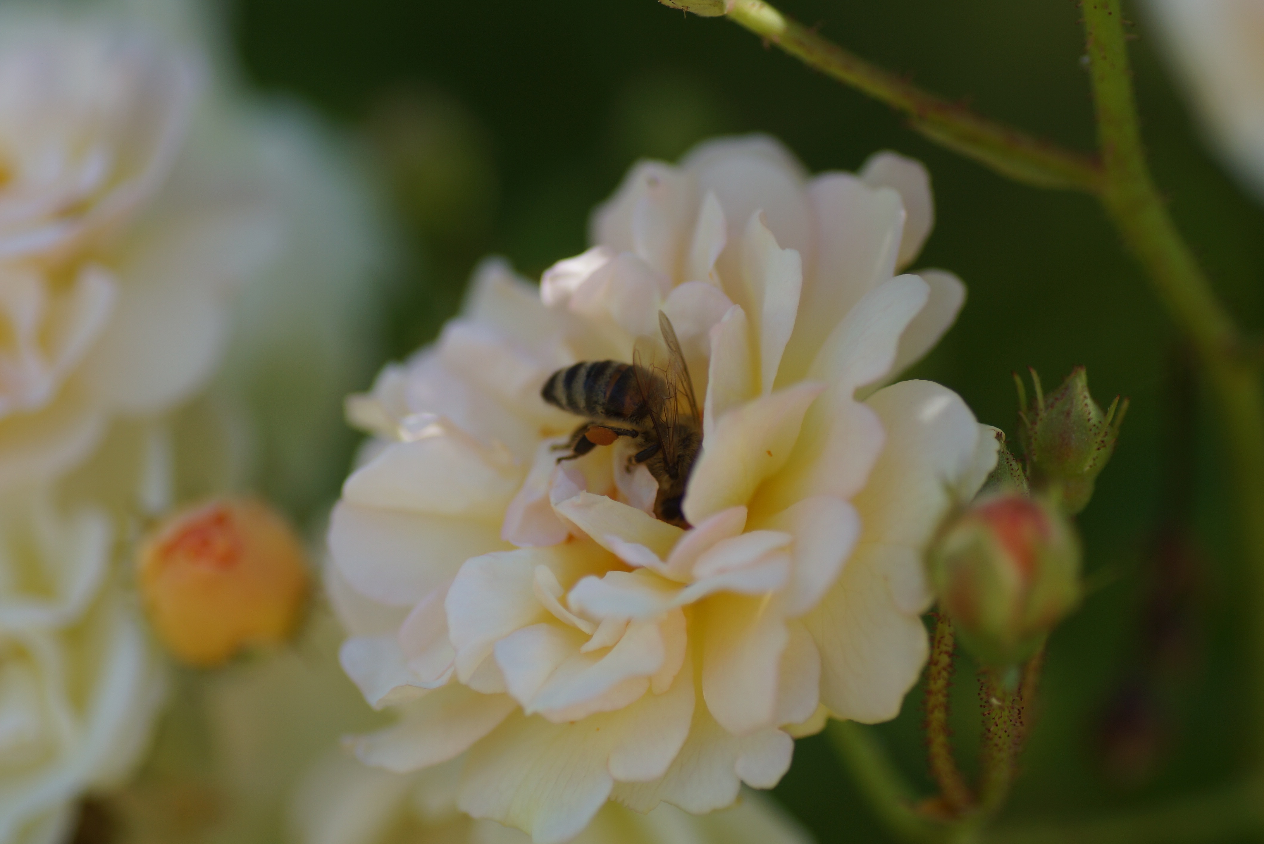 Endlich weiß ich, woher die vielen Pollensammlerinnen mit dem orangen Pollen kommen – von unserer Rambler-Rose Ghislaine de Feligonde 🙂