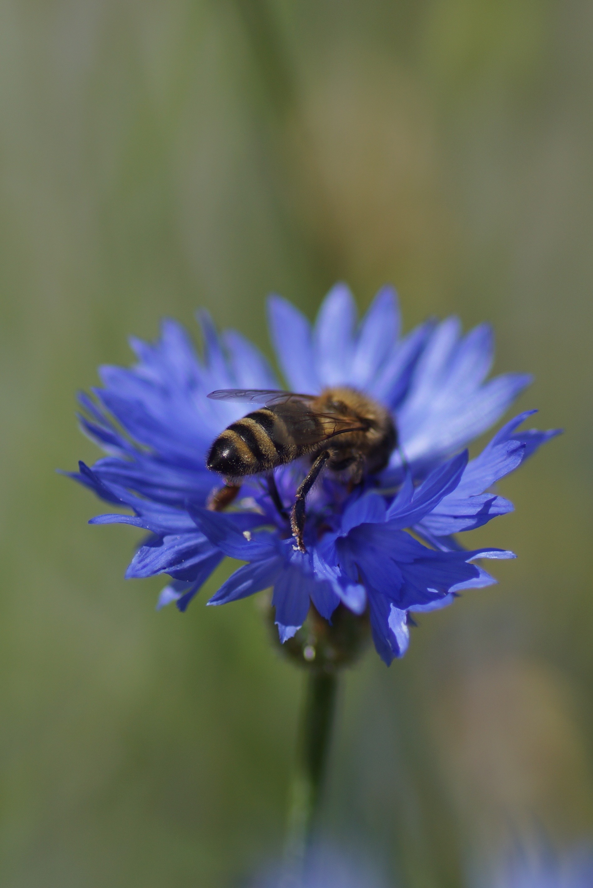 Die Kornblumen auf dem Blühstreifen an der Straße sind sehr beliebt – schade nur dass die Bienen ständig von den vorbeifahrenden Kieslastern und Betonmischern von den Blüten geweht werden 😦