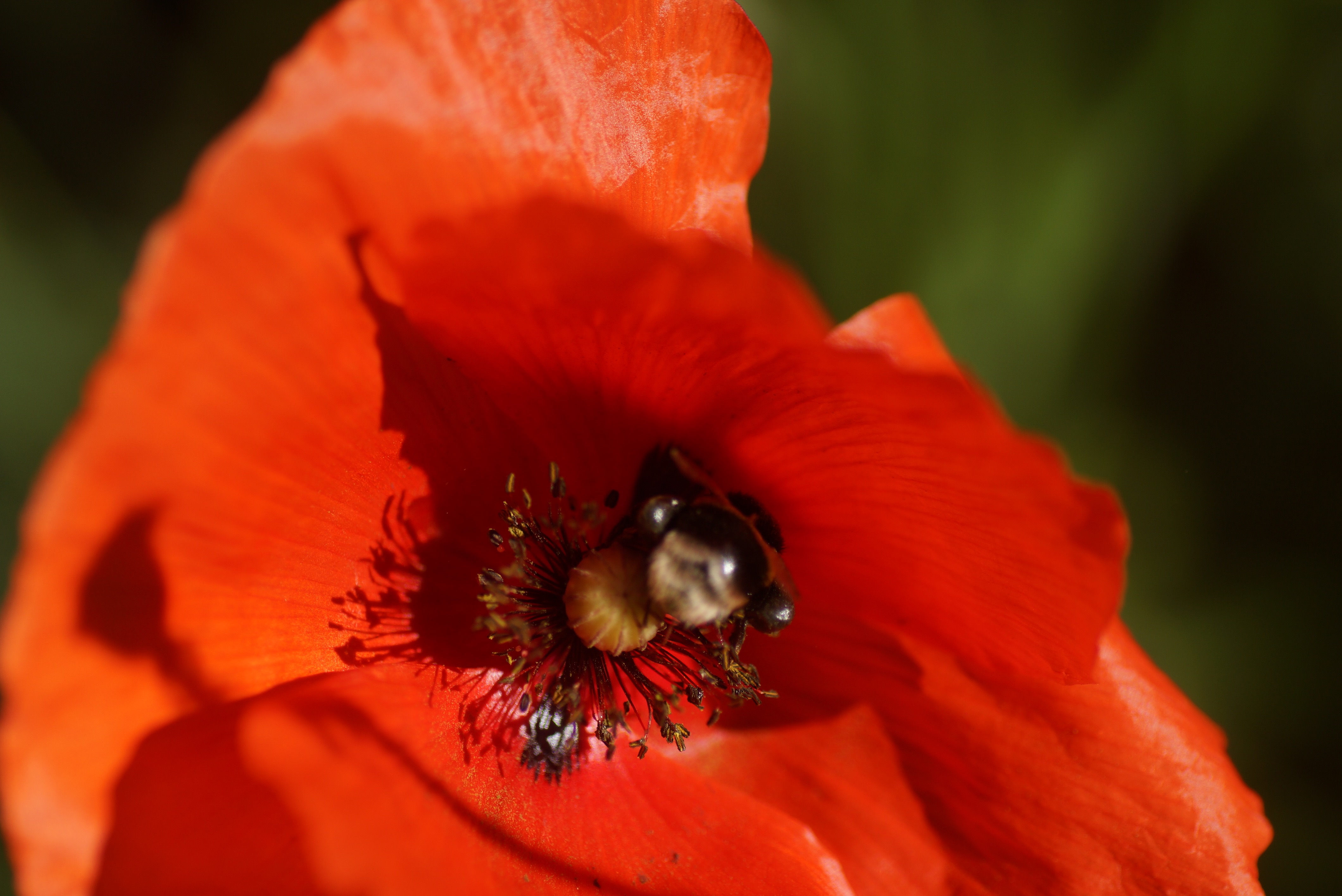 Schwer mit schwarzem Pollen bepackte Hummel (ebenfalls auf dem Blühstreifen) – hauptsächlich in den frühen Vormittagsstunden besucht. Vermutlich ist danach einfach schon der Pollen abgegriffen…