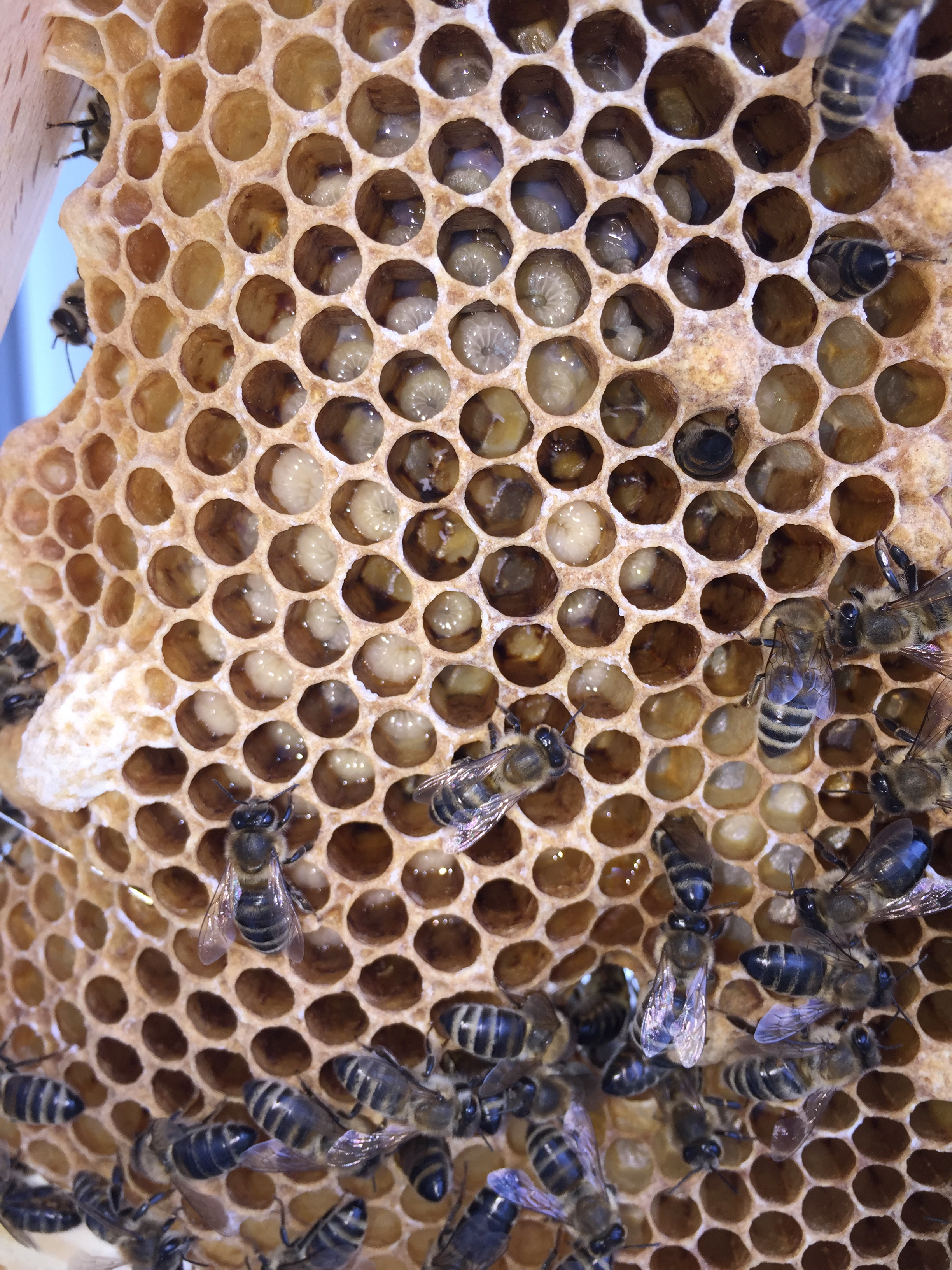 Ich glaube, wir haben hier einen relativ ungewöhnlichen Verlauf der Dinge – denn eigentlich gilt ja ein drohnenbrütiges Volk als unrettbar. Wenn es wirklich so wäre, hätten wir wahnsinnig Glück gehabt, dass die Weiselprobe noch im richtigen Moment eingehängt wurde. Die andere nicht so schöne Möglichkeit wäre, dass eine Jungkönigin nicht begattet wurde und somit auch nur Drohnen produzieren könnte (und es lagen ja viele Eier auf dem Grund der Zellen, das können Arbeiterinnen eigentlich nicht).