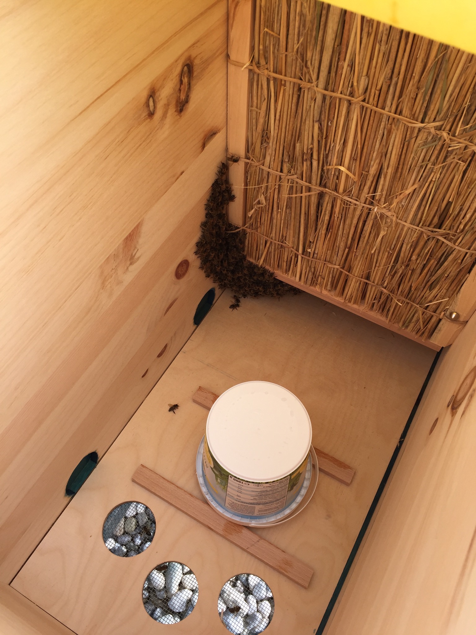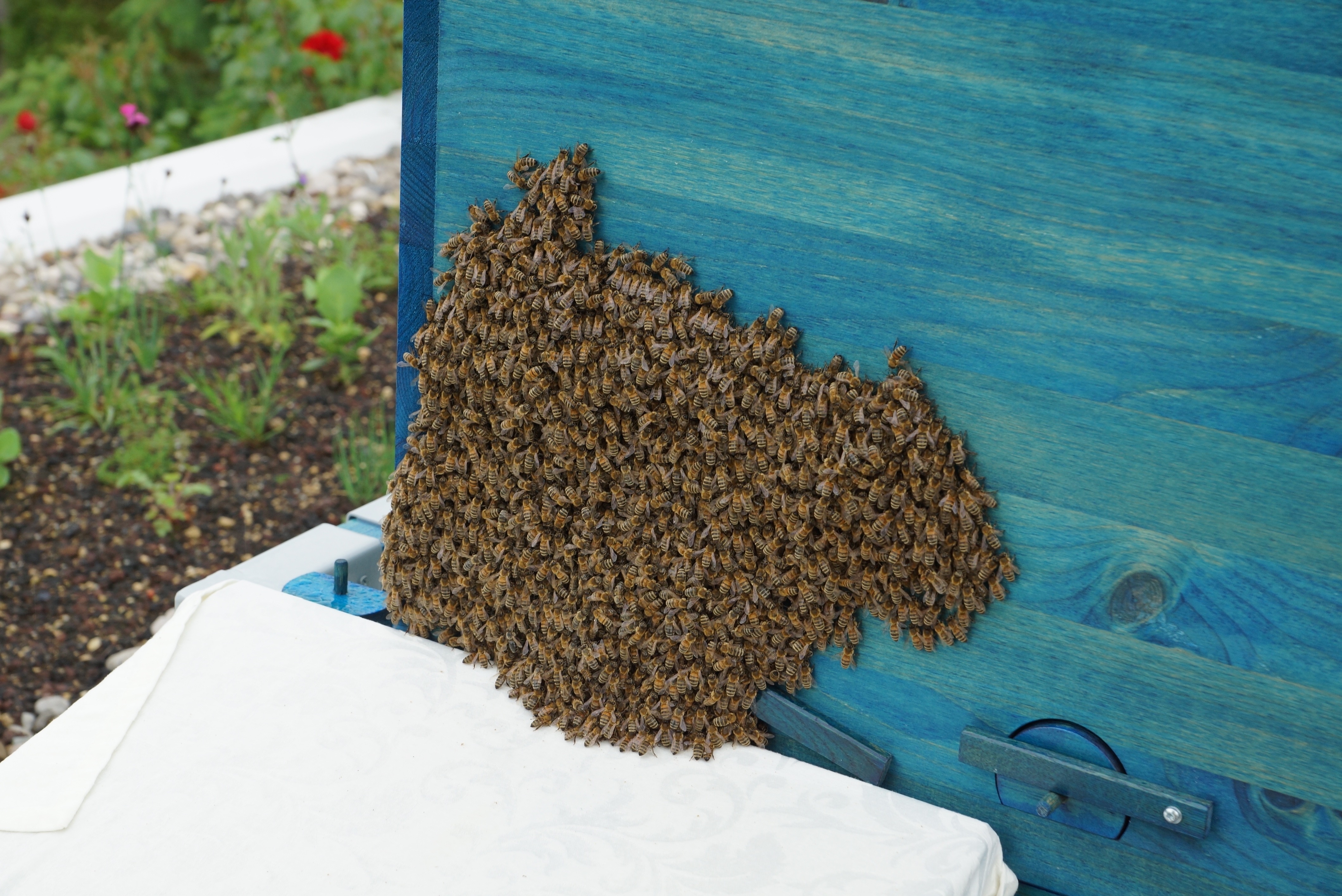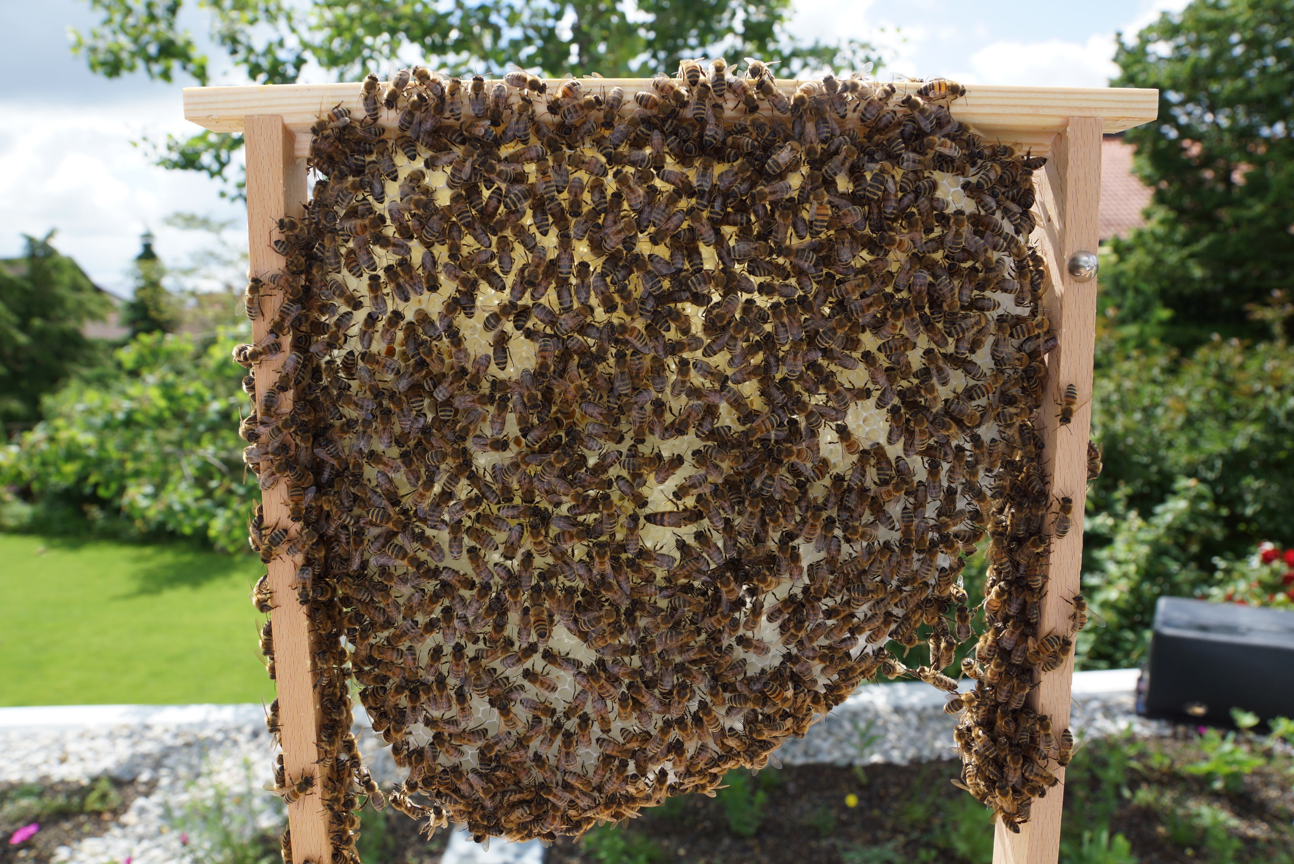 Viele Weiselzellen waren es bei diesem Volk ohnehin nicht. Das Volk hat immer noch recht viel Bienenmasse, und ich möchte eigentlich nicht, dass jetzt nach dem vorweggenommenen Schwarm noch ein Nachschwarm abgeht – dafür stehen zu viele sehr hohe Bäume in der Nachbarschaft. 😉 Die Durchsicht war aber so richtig ungemütlich, weil das (noch) weisellose Volk so richtig laut und unruhig war, Unmengen an Bienen bei jeder Bewegung nervös aufflogen und ich leider trotz Rauch (den ich sehr selten benutze) auch mehrere beim Wiedereinsetzen der Rähmchen zerquetschte. Aggressiv waren sie aber nicht, nur einfach sehr, sehr unruhig. Ich habe versucht, die Beute mit dem Wachstuch und Dämmplatte so abzudecken, dass wirklich nur der aktuell benötigte Bereich offen war, aber das hat auch nichts mehr gebracht. Ich war selber ganz fix und fertig, als die Kiste endlich wieder zu war…