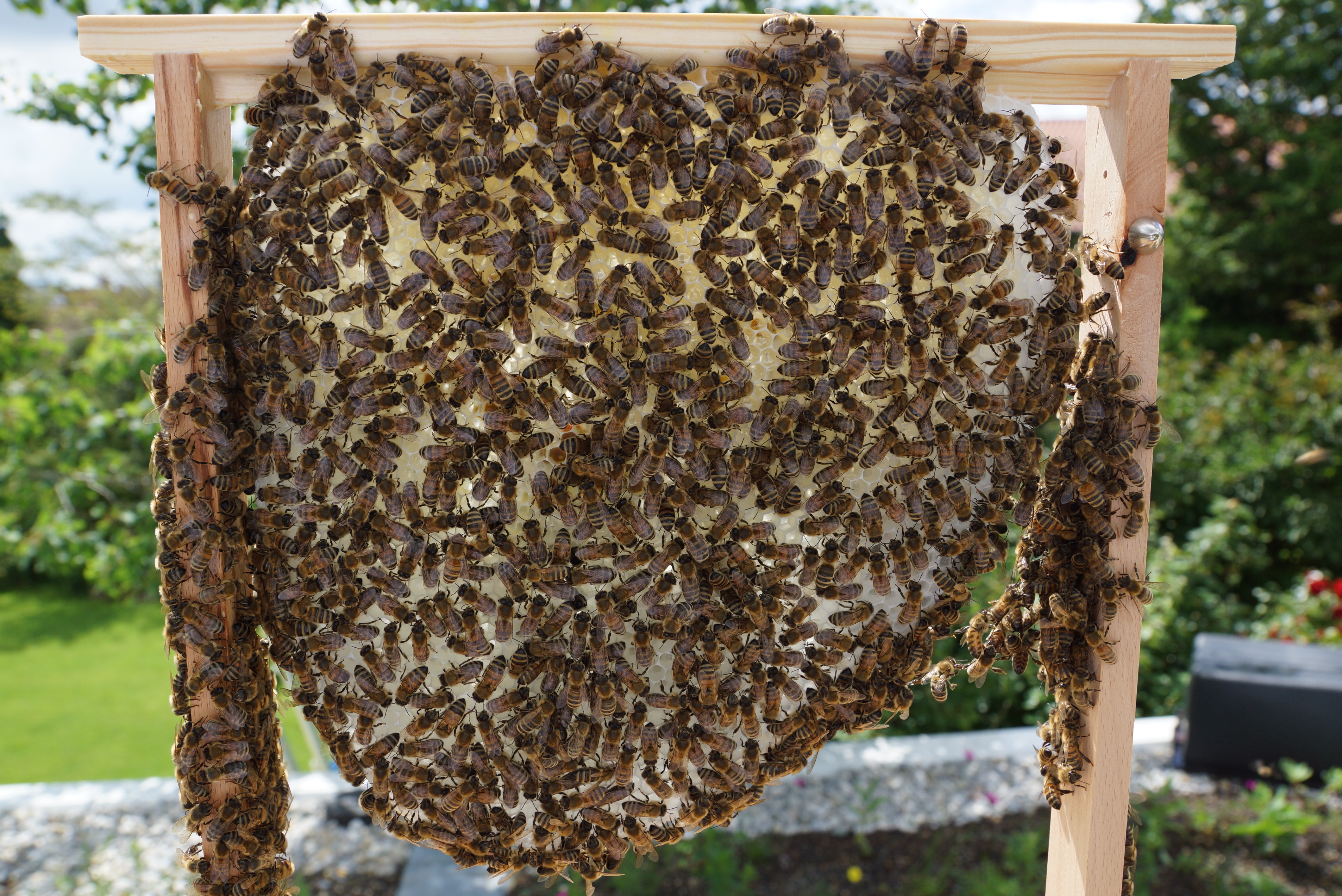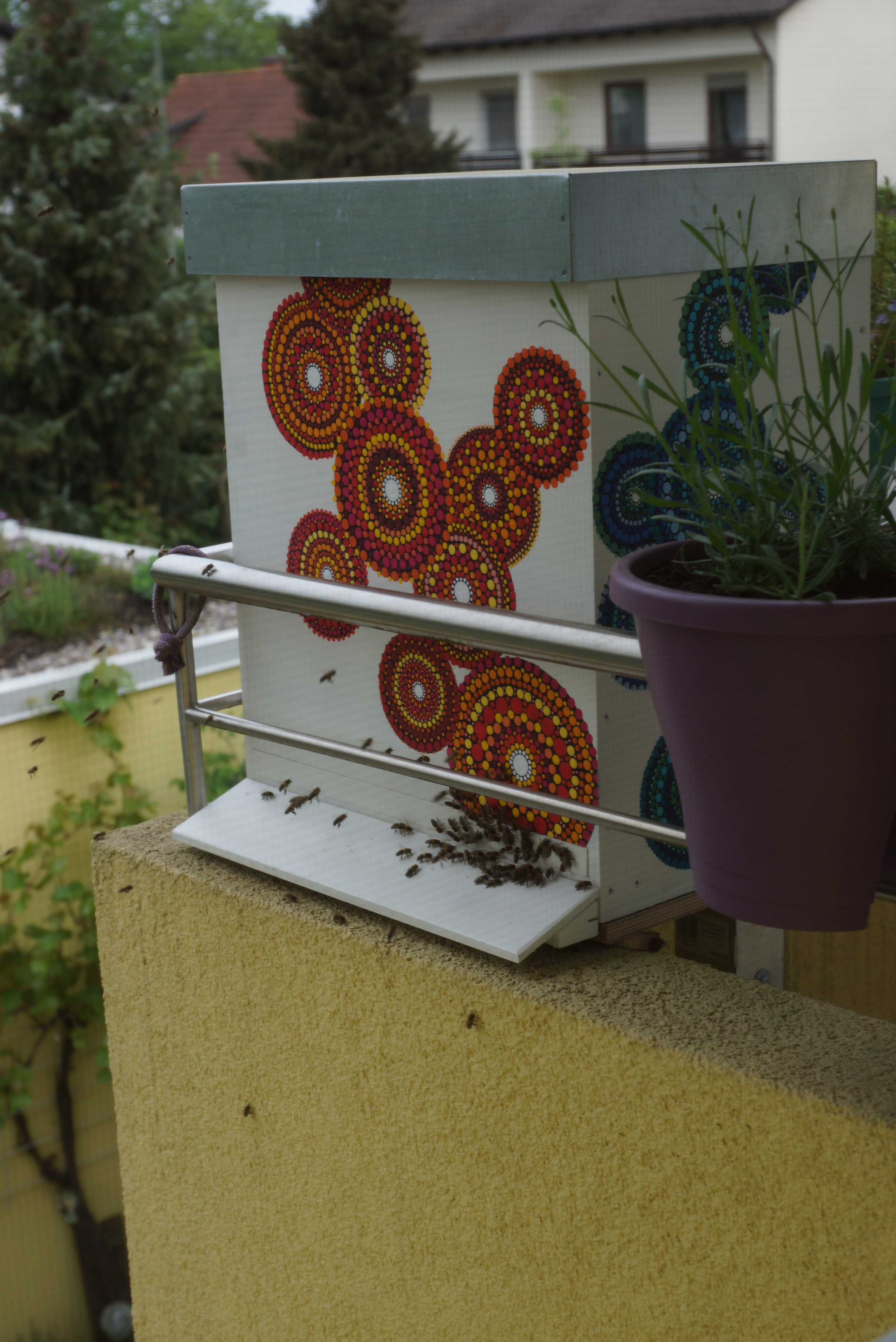 Eigentlich wollte ich ja nur den Futtereimer entnehmen und kontrollieren, ob das Balkonvolk ein neues Rähmchen zum Bauen vertragen kann, und dann das:
