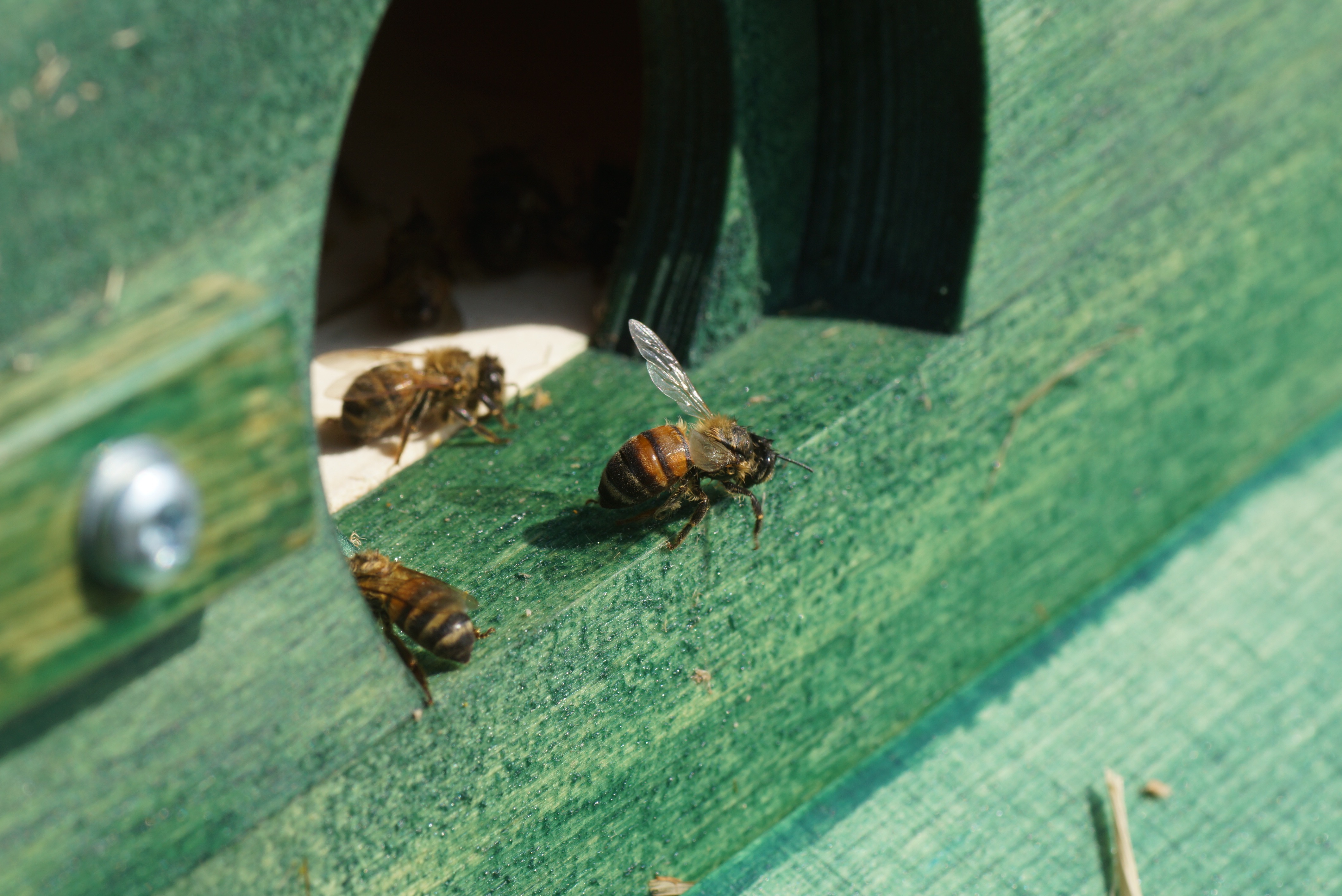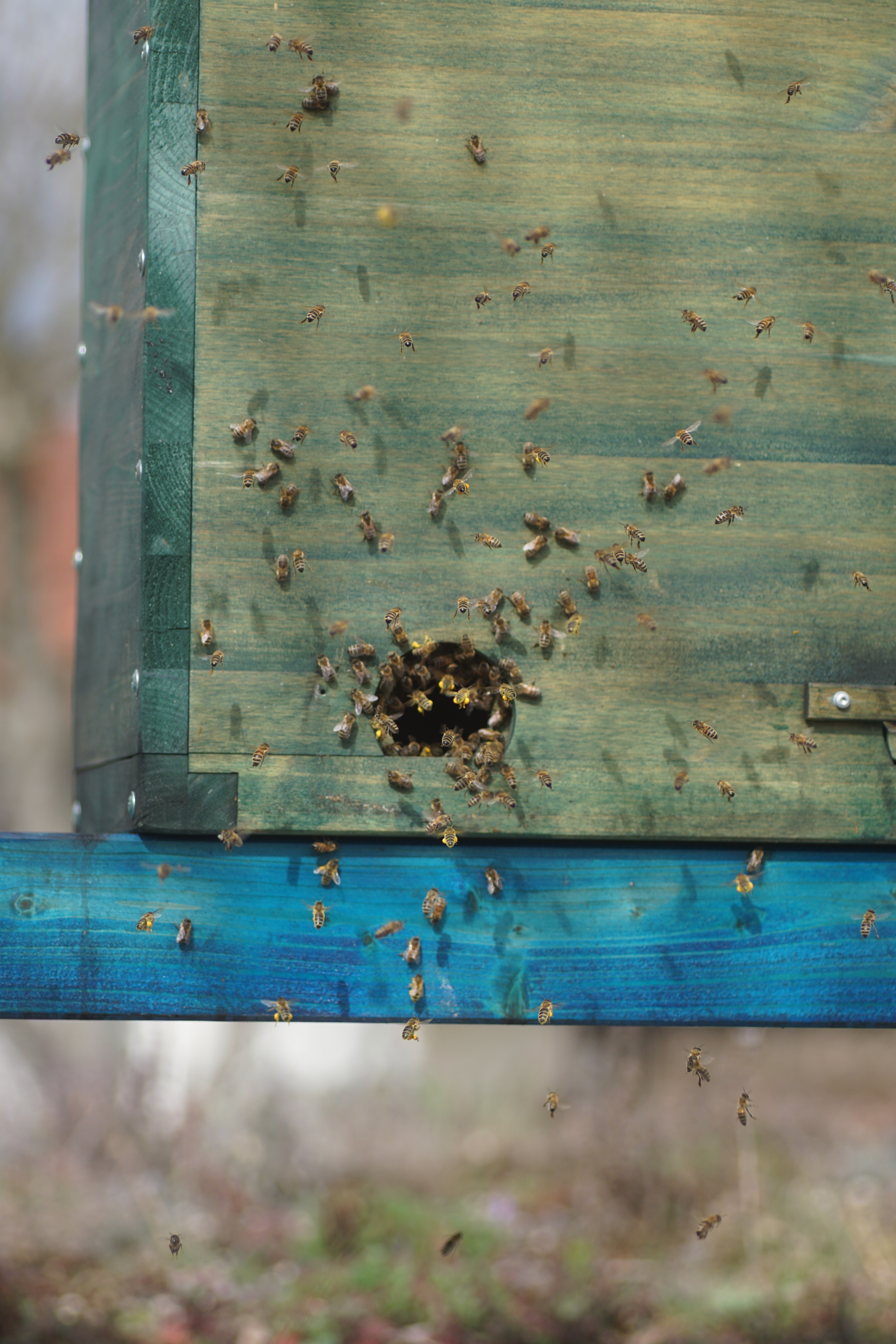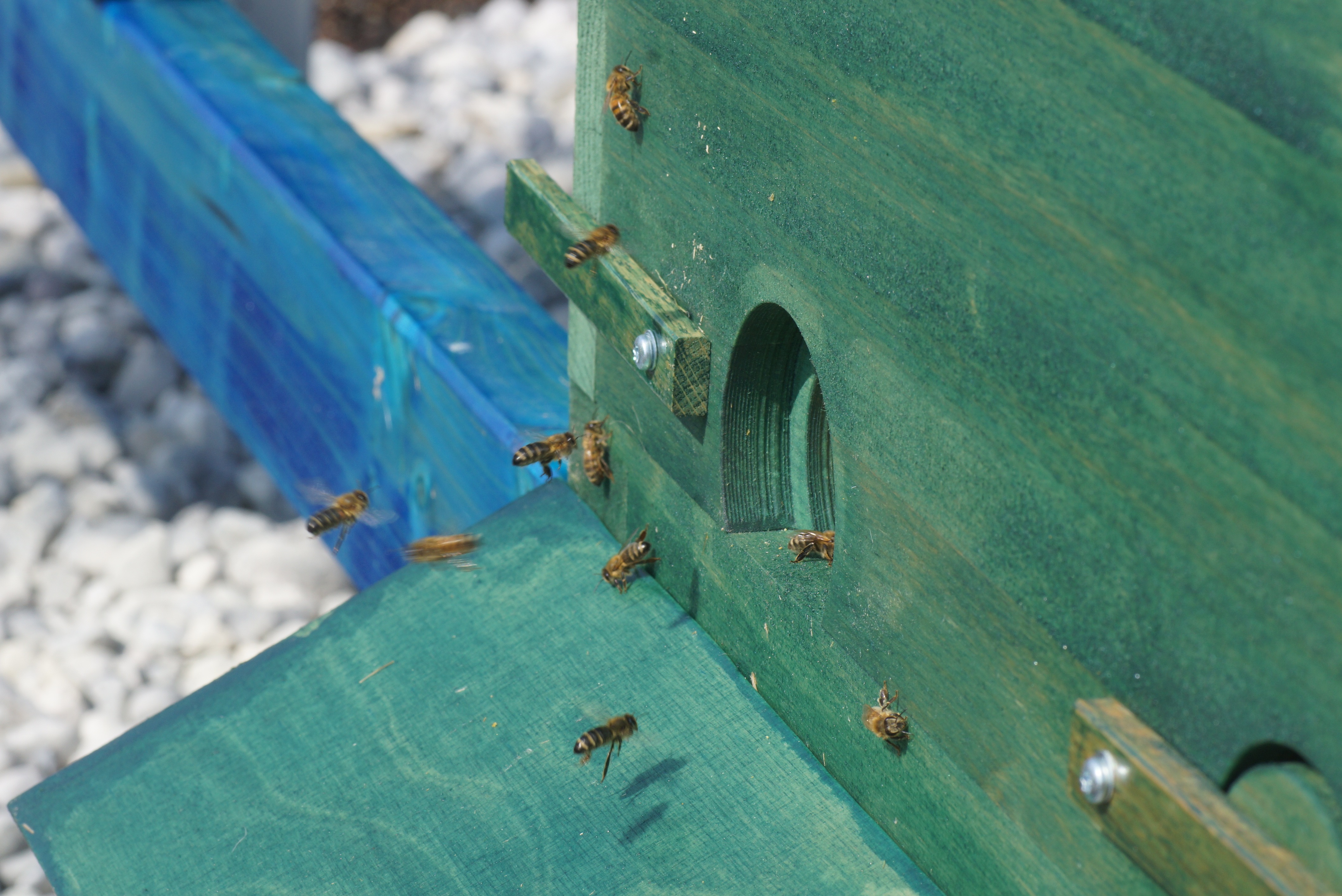 Während Tobi und ich dann beim Mexikaner und im Kino waren, spazierte der Rest fast vollständig in die Beute. Kurz nach Mitternacht habe ich dann die restlichen Bienen ein wenig angeschoben, den Fluglochkeil eingesetzt und die Beute an ihren designierten Platz gehoben. Vom Bett aus war noch ein klein wenig Summen zu hören… 🙂 Samstag Morgen begannen die Bienen dann schon trotz Bewölkung um kurz nach sechs Uhr mit dem Einfliegen, und haben es bis zum späten Nachmittag noch nicht eingestellt – sehr fleißig!