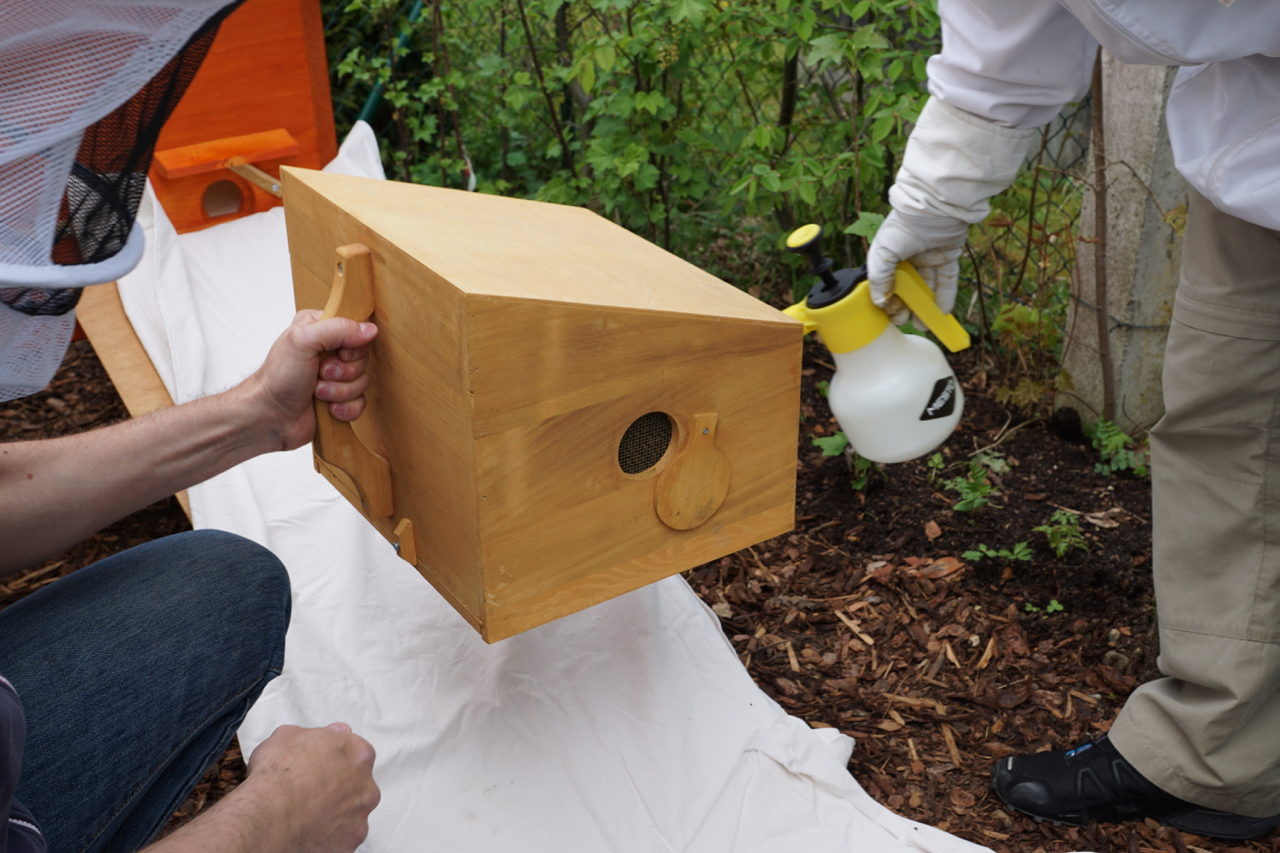 Die danach von den Ästen abgestoßenen Bienen rannten geradezu in Richtung Kiste. Da waren dann schon zwei Hände mehr wieder echt praktisch! Gute anderthalb Stunden später nach einem netten Ratsch mit Bine und hin und wieder etwas „Bienen beseln“ war der Schwarm dann im Kasten. Und beim Anheben dachte ich mir schon, ups, die sind ganz schön schwer! Beim Rübertragen in unseren Garten wurde daraus ein „Holla, die sind richtig schwer, das sind gute 3 Kilo!“. Die Waage zu Hause ergab dann unser neues Rekordgewicht von sage und schreibe 4,5 Kilogramm! Sie hingen schön an der Decke und waren mucksmäuschenstill. Für die Fahrt bekam Bine noch eine Sprühflasche mit Wasser mit, um bei Bedarf die Bienen noch etwas „abkühlen“ zu können.