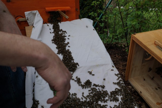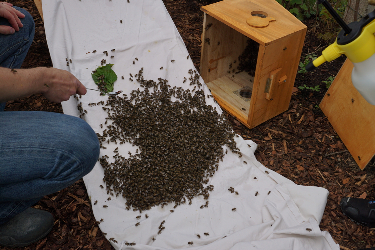 Die Königin schien aber gleich beim ersten Schwung mit in die Kiste gekommen zu sein, denn man konnte gleich erkennen, dass sich die fliegenden Bienen in Richtung Kistenwände orientierten. Wir haben dann die Kiste langsam umgedreht und auf ein paar Steine aufgebockt.