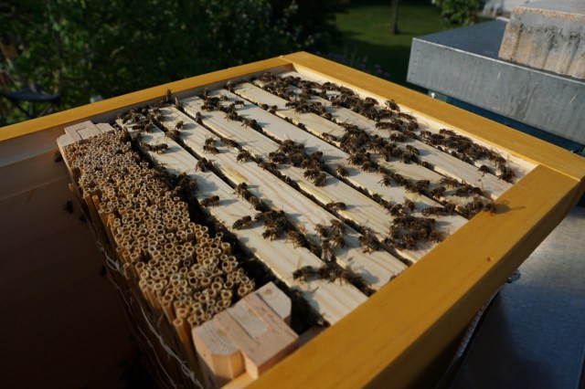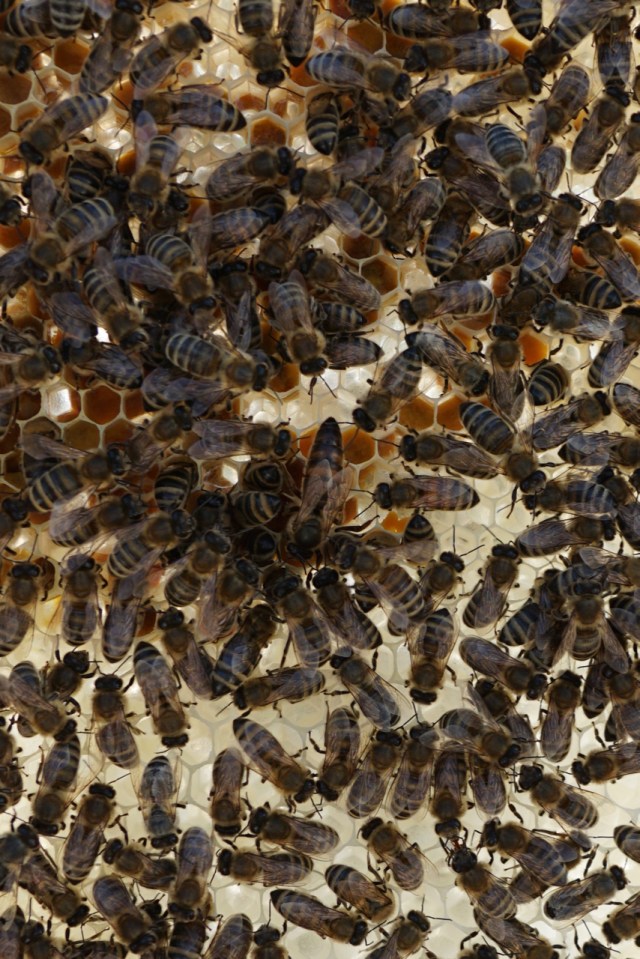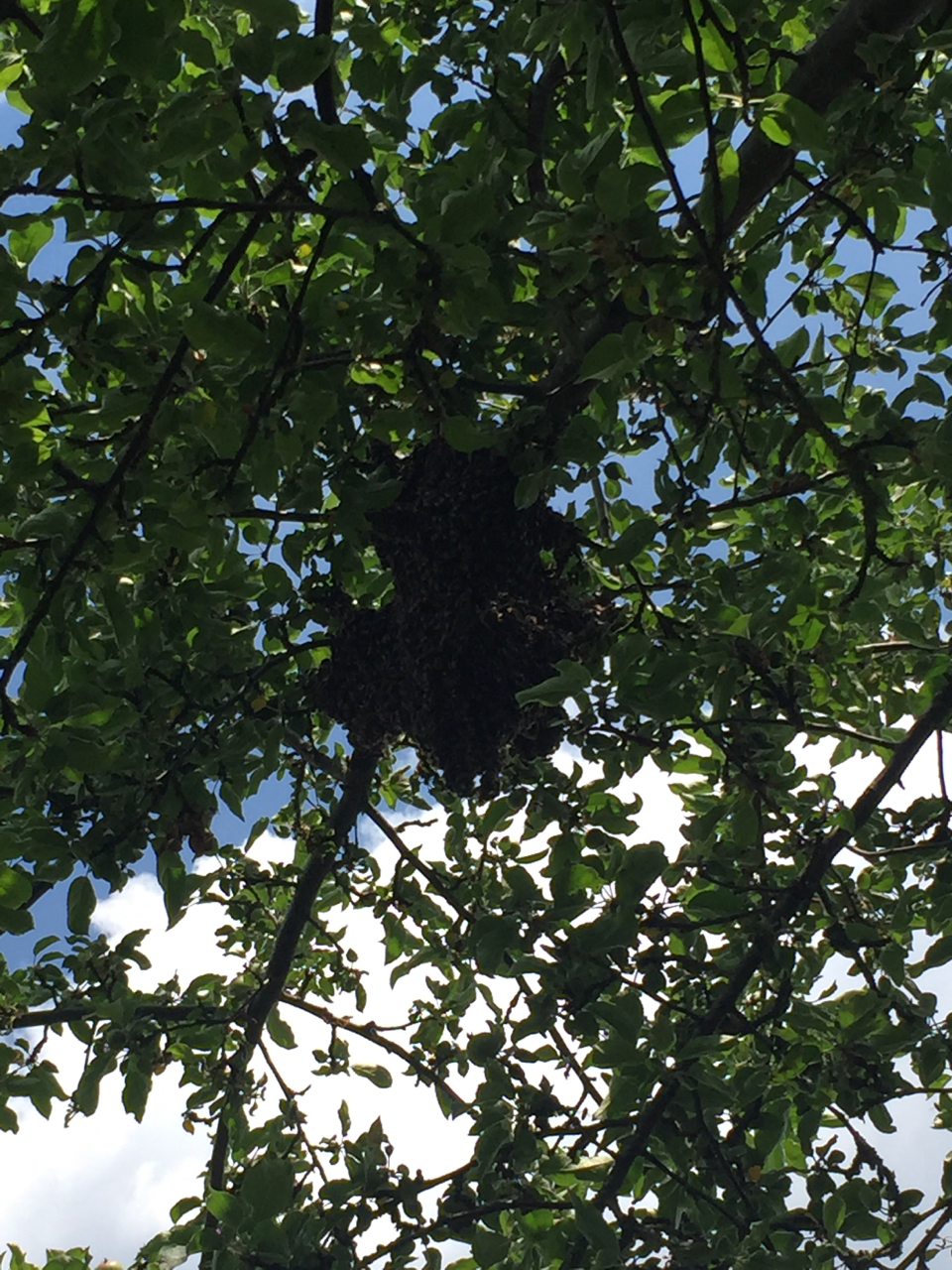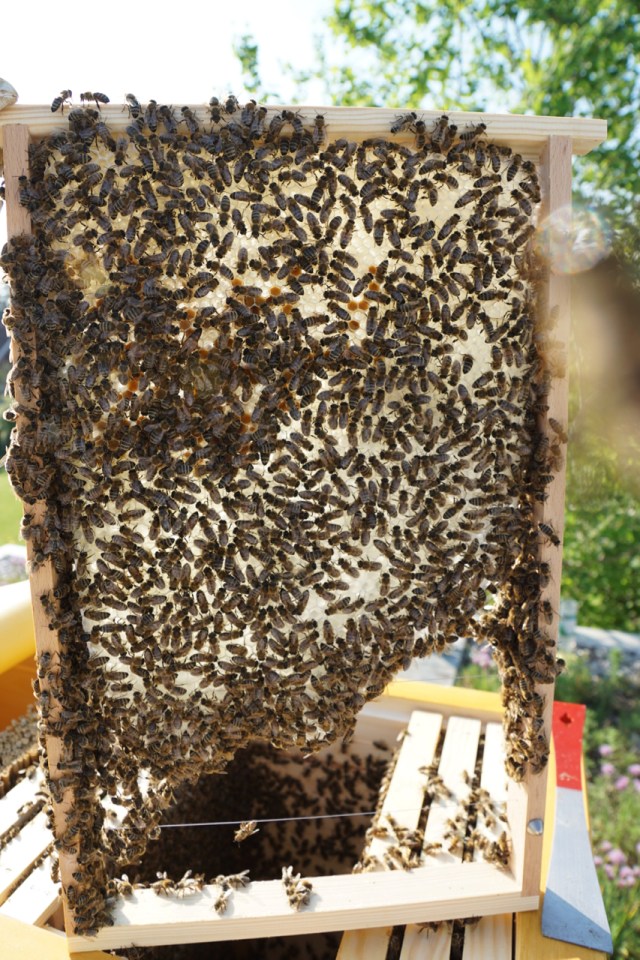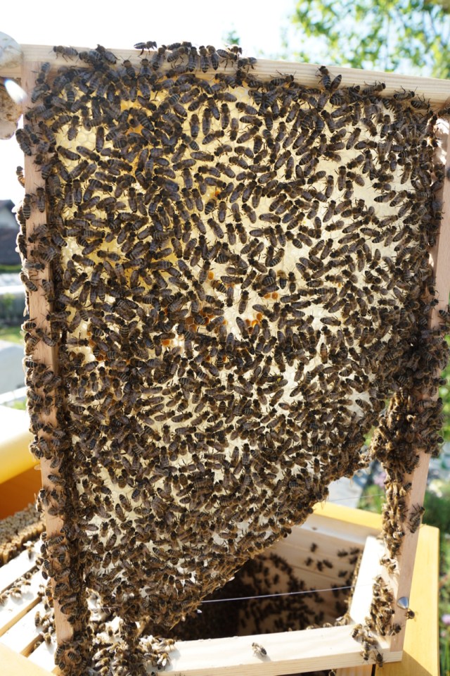 Nach der Ernte zu Hause ging es gleich noch an der Montessorischule weiter. Auch hier hatte der Riesenschwarm schon eine ganze Menge Honig mitgenommen – jede Biene füllt ihre Honigblase mit etwa 0,05ml Honig. Das klingt nicht viel, ist aber immerhin etwa die Hälfte des eigenen Körpergewichts!