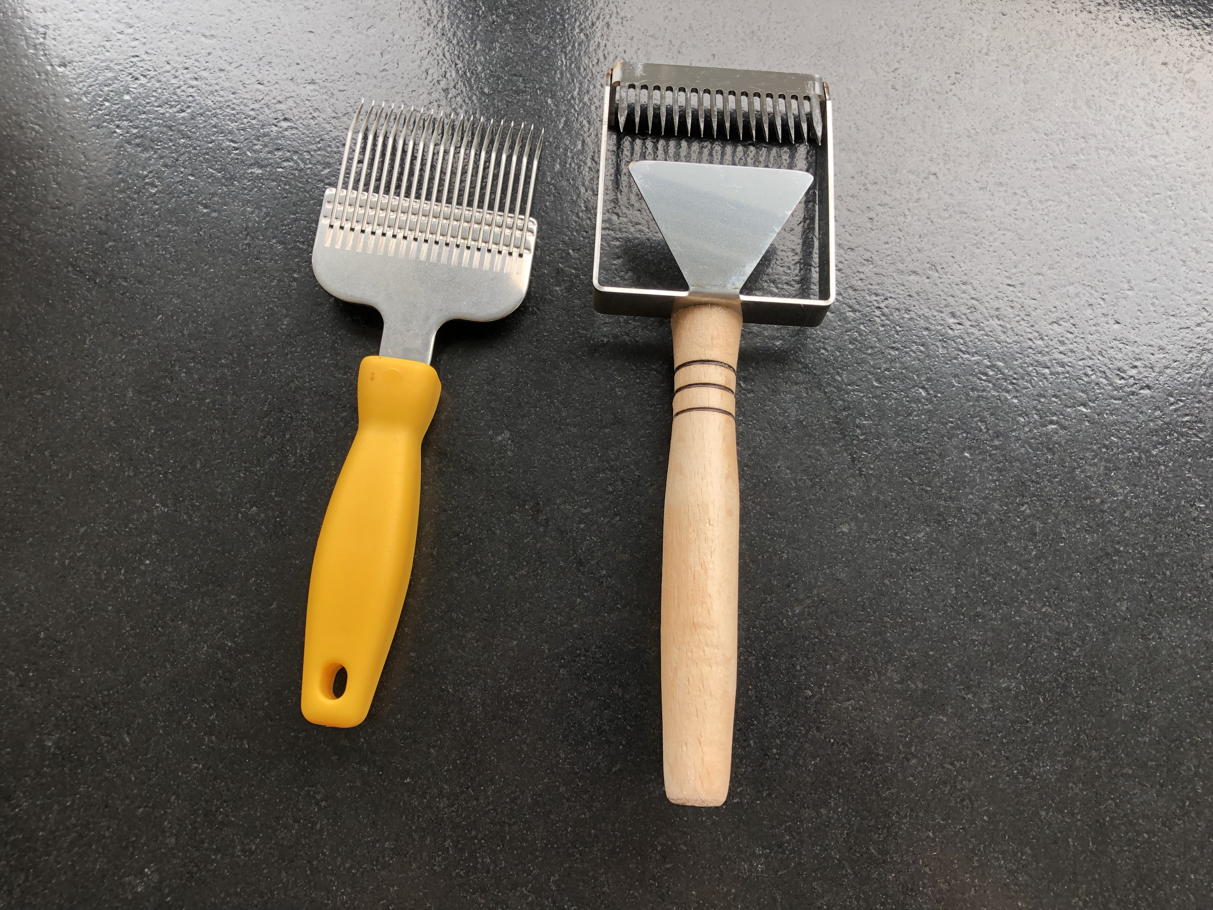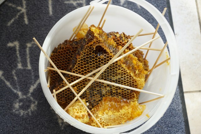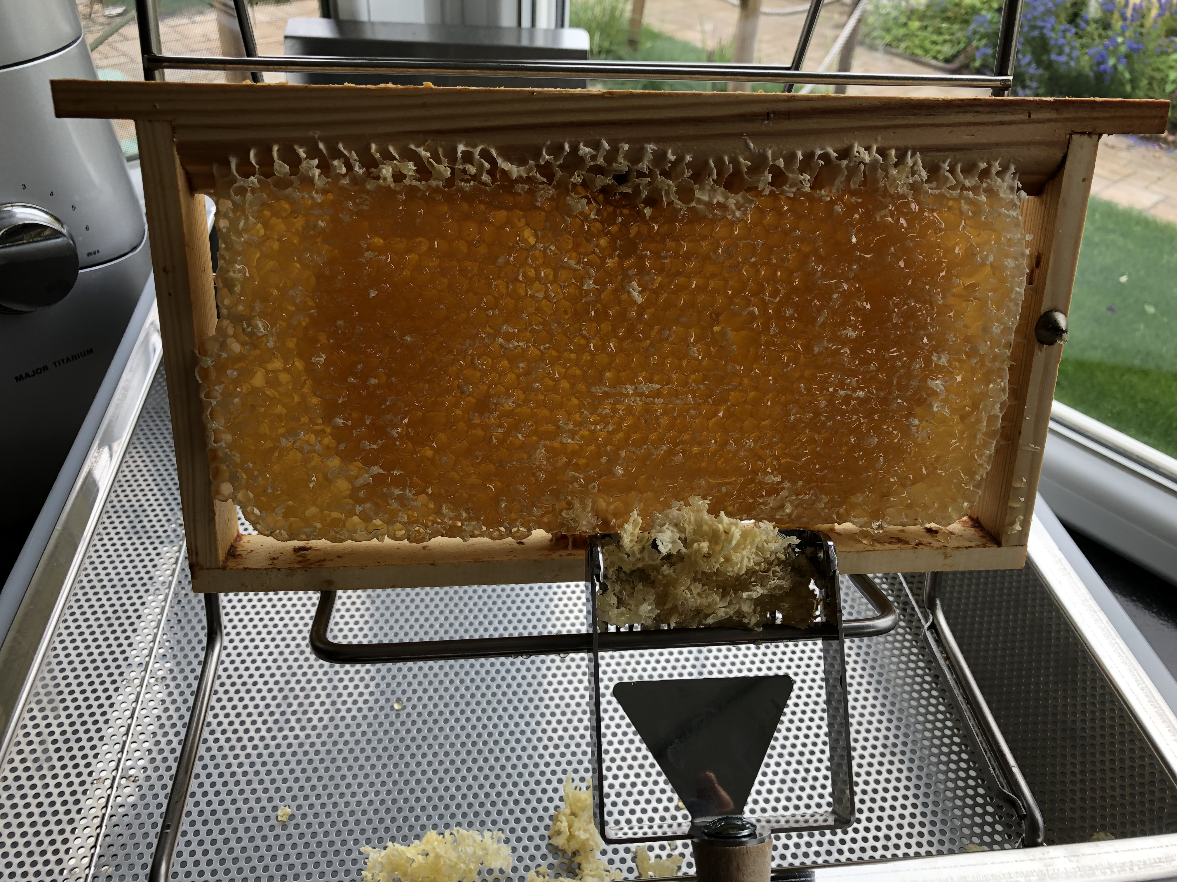 Als nächstes werden die Waben dann entdeckelt. Der Wachsdeckel wird mit einer speziellen Entdeckelungsgabel abgeschabt, damit der Honig in der Schleuder aus den Zellen laufen kann. Ich habe hier mal versucht das bei einer Wabe von meiner eigenen Ernte zu filmen – was aber nicht ganz so einfach war, weil die Augen immer zwischen der Entdeckelungsgabel und dem Handybildschirm hin- und herhupfen wollen und die Kamera dann entsprechend mitwandert! Entschuldigt also bitte die schlechte Kameraführung!