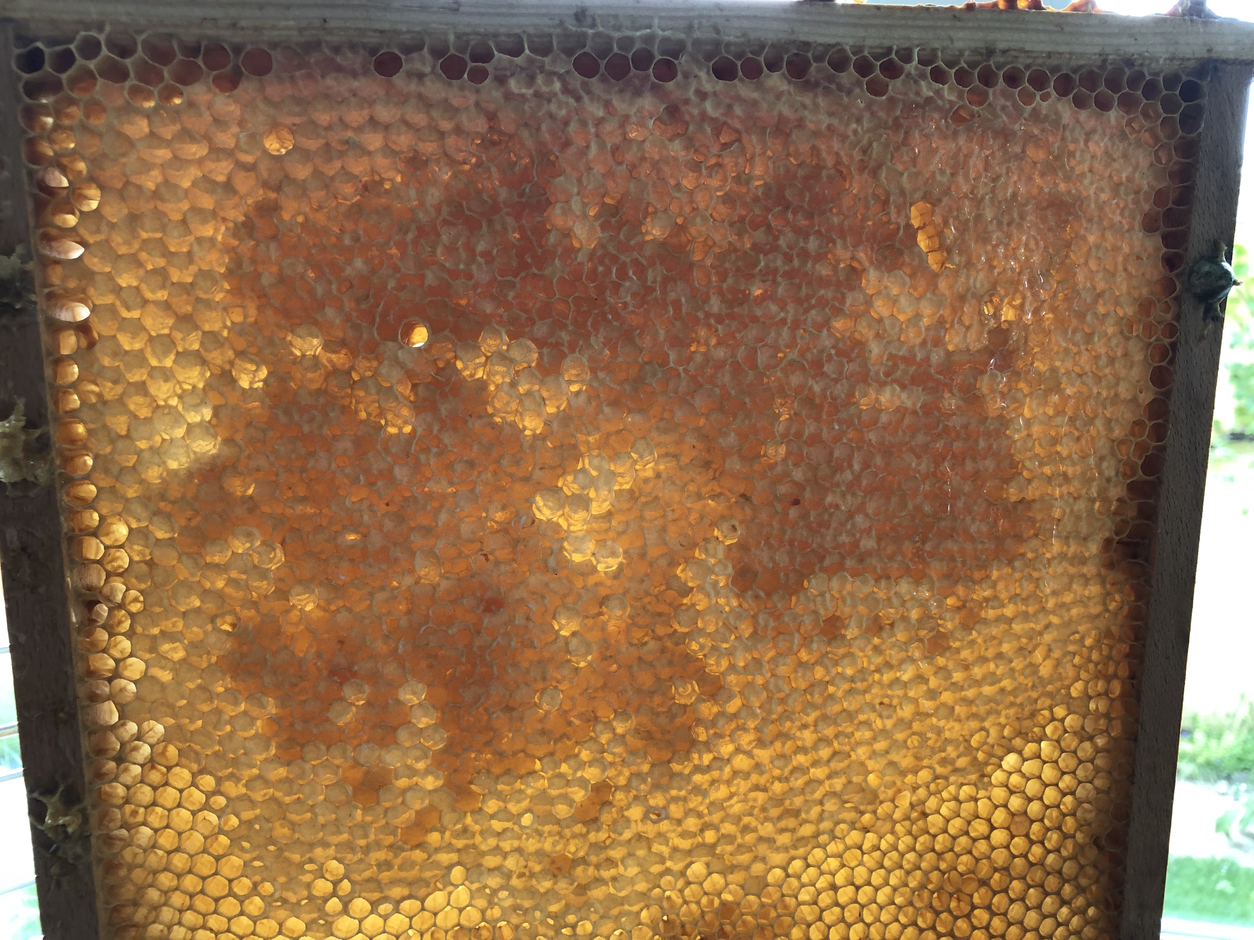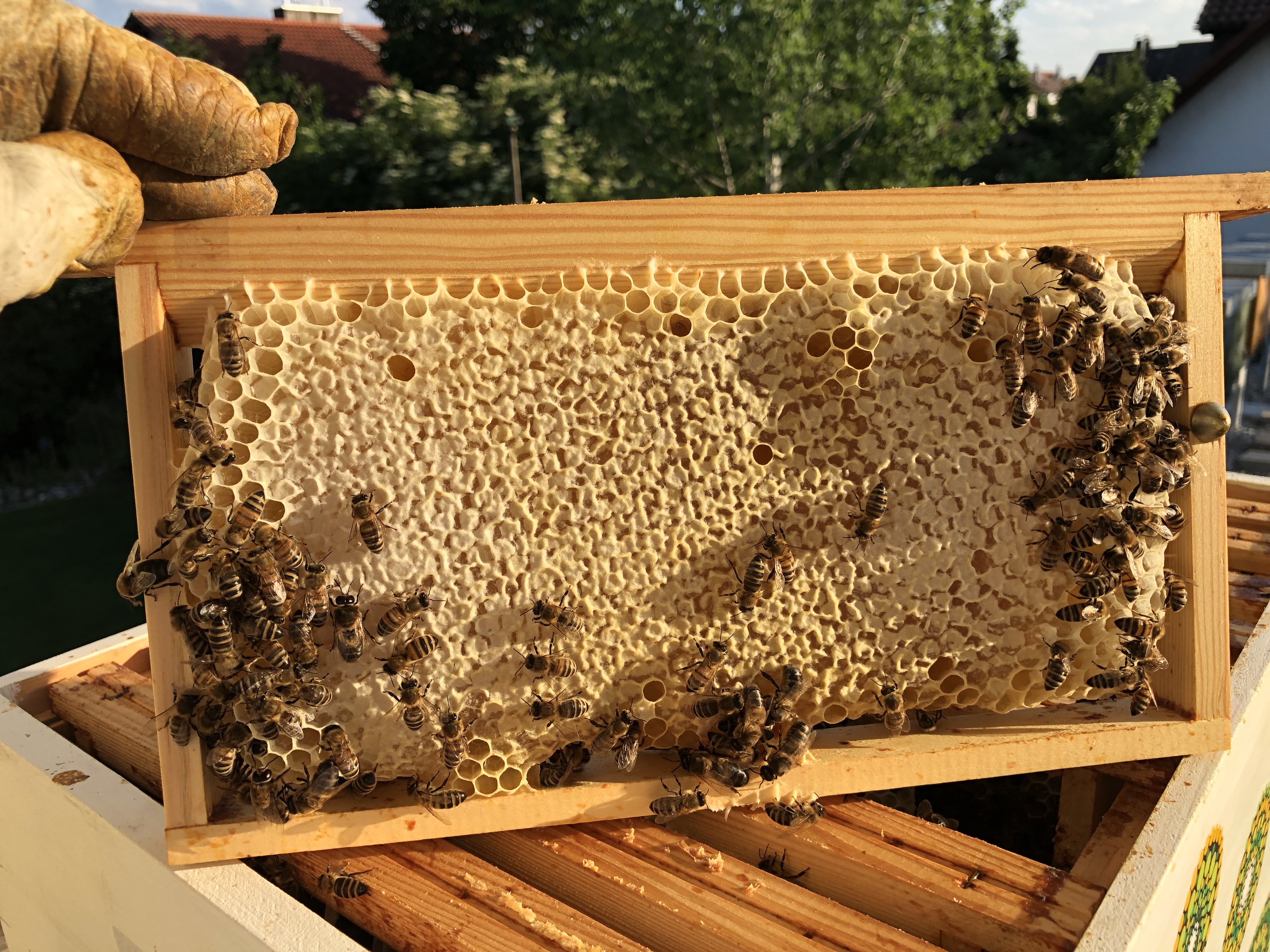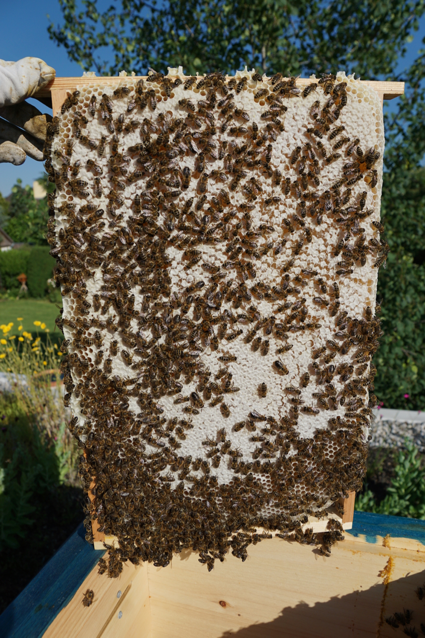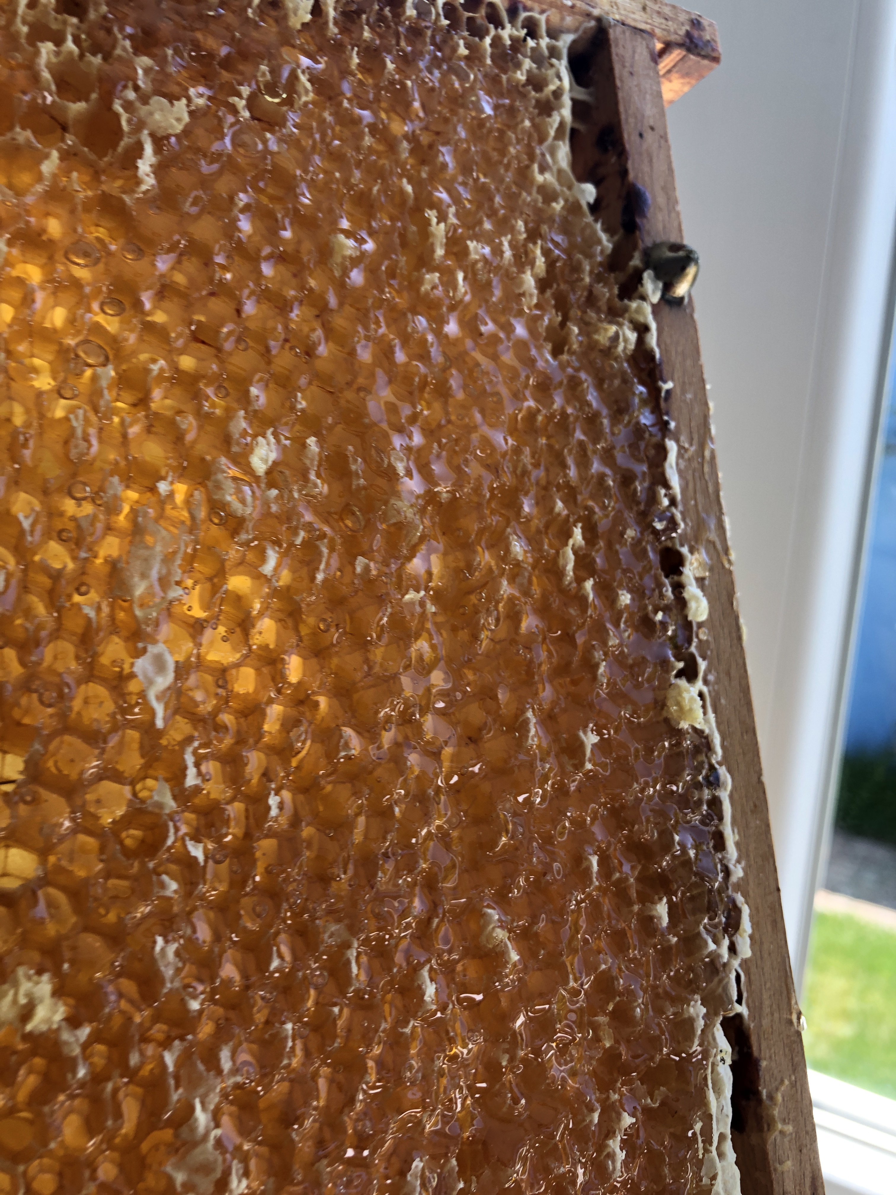Trotz des fast vier Kilo schweren Schwarms konnte ich aus der kleinen ERB noch Honig ernten. Aus der großen Beute habe ich nichts entnommen, da sie bis vor kurzem immer noch am Hinterherhinken waren und ich auch im Frühjahr noch einmal zugefüttert habe. Vielleicht können sie bis zum Sommer noch mehr einlagern, was wir dann ernten können. Hier ein Bild von einem der geernteten Honigrähmchen: