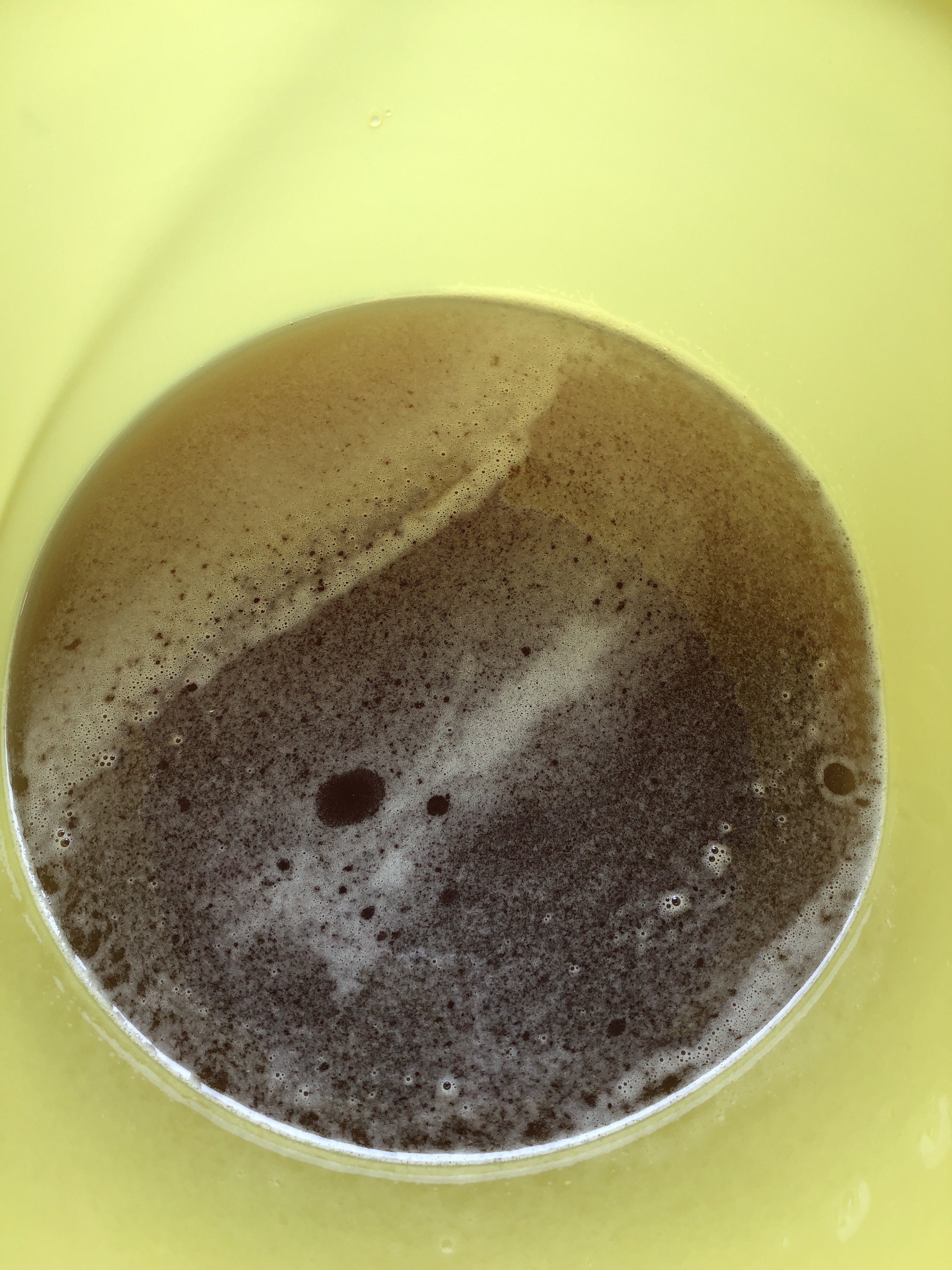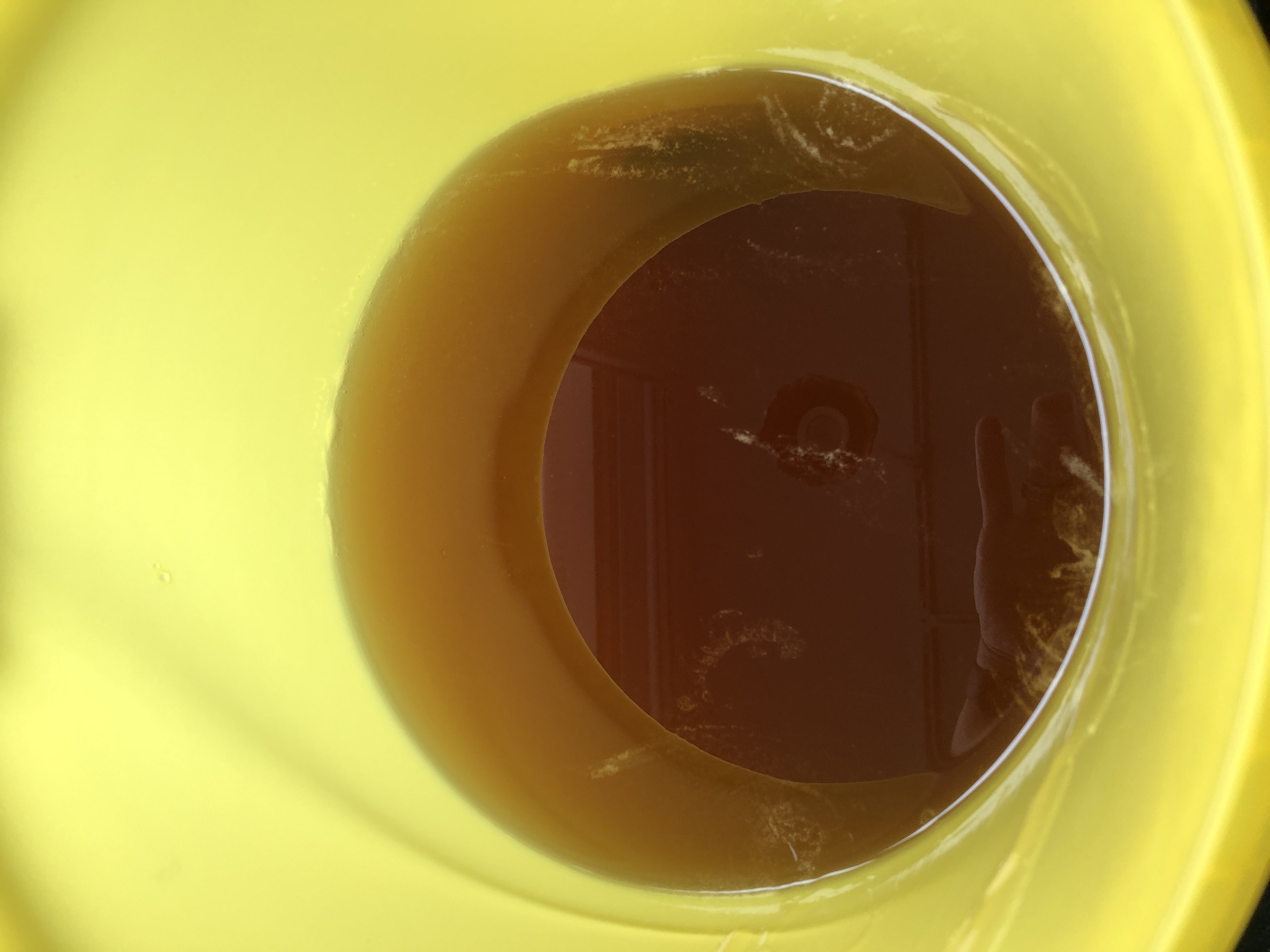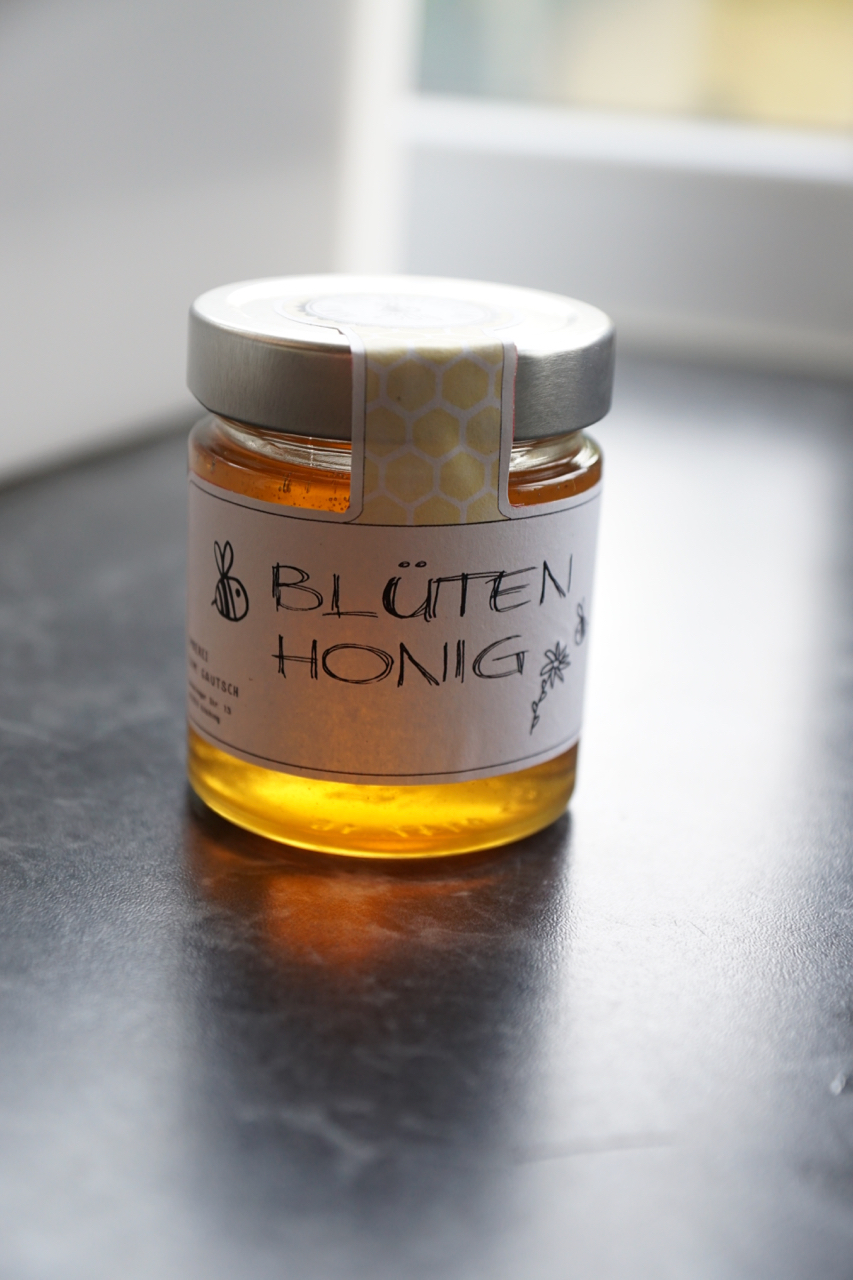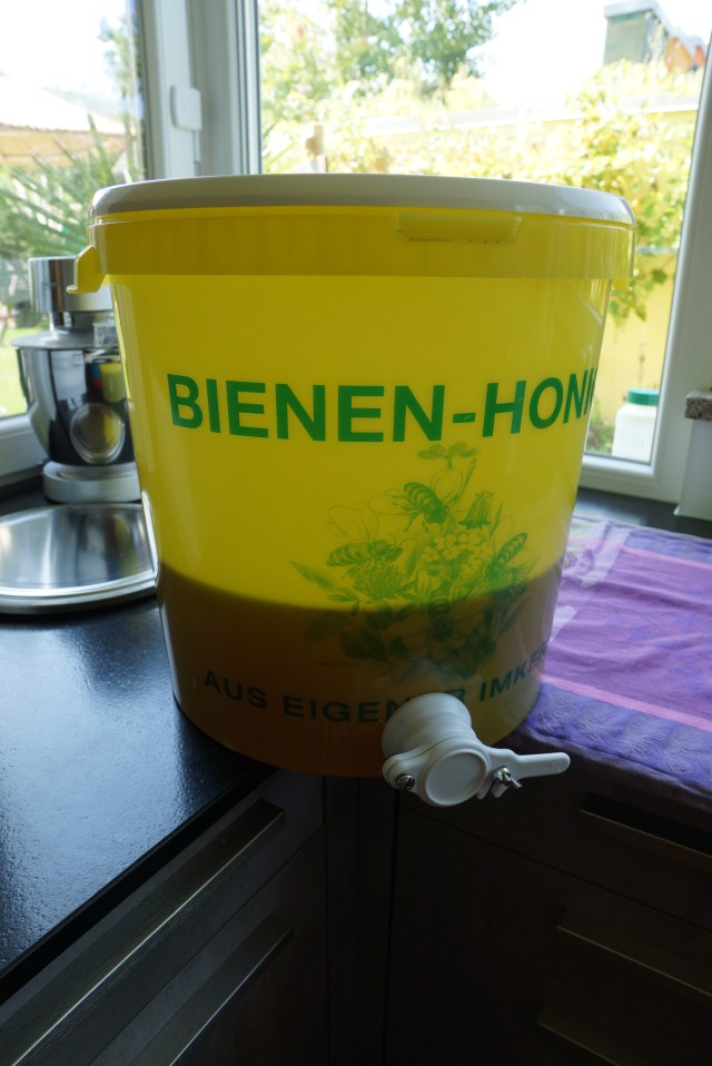 Man lässt den Honig ein einem luftdichten Honigeimer über Nacht ruhen, bevor er am nächsten Tag noch gekärt wird. Dazu entfernt man vorsichtig am nächsten Tag den oben aufsitzenden „Schaum“ aus Luftbläschen, Pollenresten und feinsten Wachsteilchen. Ich benutze dazu eine flexible Teigkarte. Den Schaum darf dann das Imkerlein beim nächsten Frühstück genießen!