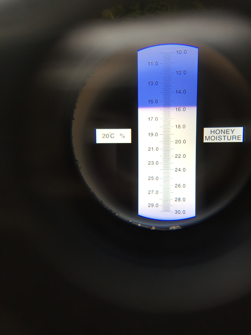 Zuerst einmal schaut man sich die Rähmchen an – als Faustregel gilt, dass etwa 80% der Zellen verdeckelt sein müssen, um einen ausreichend „trockenen“ Honig ernten zu können. Auf dem Bild erkennt man ganz gut, wo die gefüllten Zellen schon mit einer dünnen weißen Wachsschicht verschlossen wurden (oben + Mitte), und wo sie noch offen sind. Sicherheitshalber habe ich auch hier eine Stichprobe mit dem Refraktometer genommen. Damit kann man den Wassergehalt des Honigs bestimmen. Man gibt einen dicken Tropfen Honig auf die entsprechende Fläche, deckt in mit dem Deckel ab und schaut in Richtung der Sonne durch das Okular (die Öffnung für das Auge). Jetzt kann man auf einer Skala ablesen, wie hoch der Wassergehalt ist. Er muss unter 20% liegen, damit der Honig nicht zu gären beginnen kann. Die Probe ergab 18%, also konnte ich ernten.