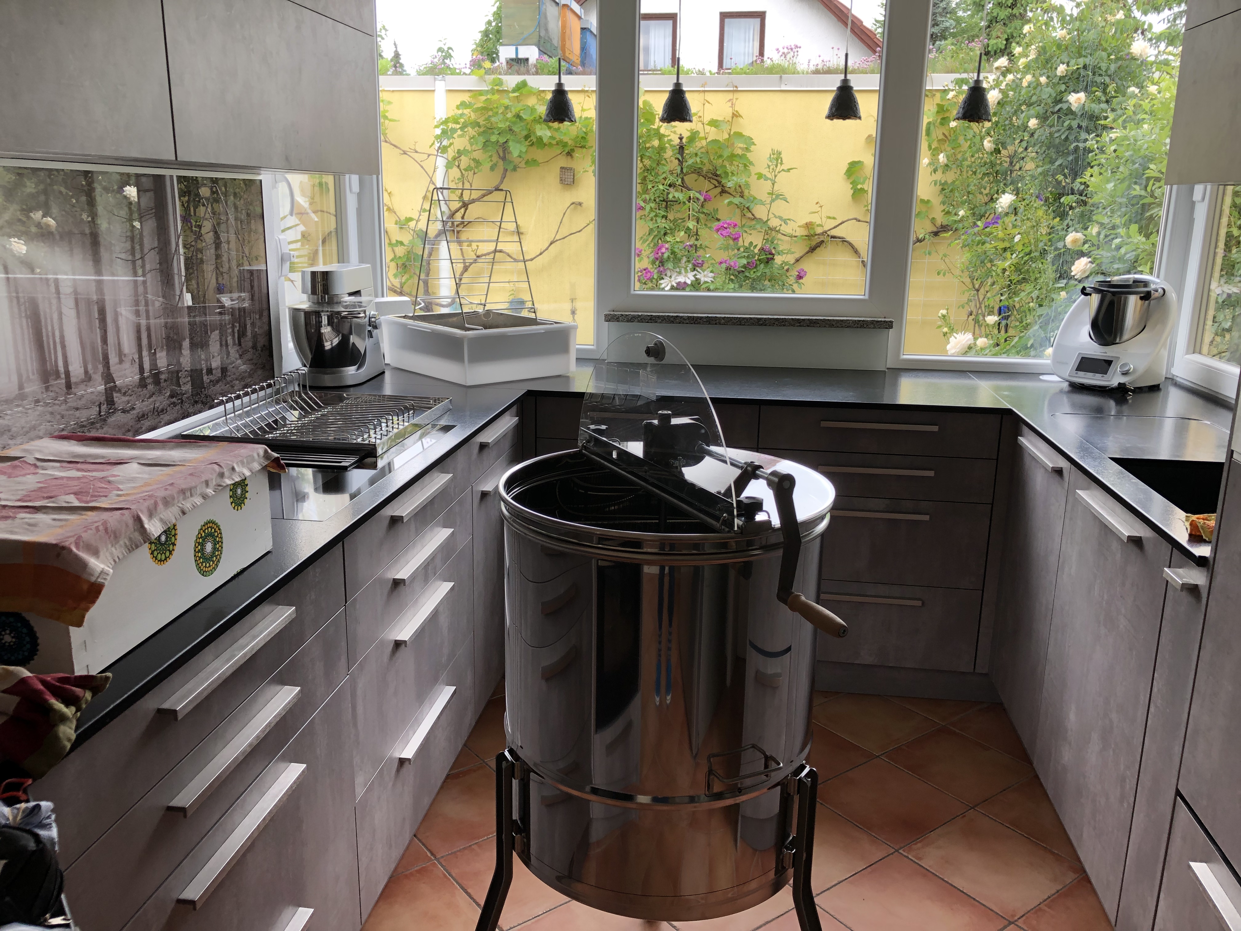 Als nächstes werden die Waben dann in die Körbe der Schleuder gestellt. Sie sollten alle möglichst gleich schwer sein, sonst hat die Schleuder beim Drehen eine Unwucht und springt unkontrolliert auf dem Boden herum! Unsere Schleuder hat drei Körbe, und man muss schon ein wenig aufpassen, wenn man unterschiedlich große Rähmchen schleudern möchte. Zwei kleine wiegen leider nur ungefähr so viel wie ein großes.