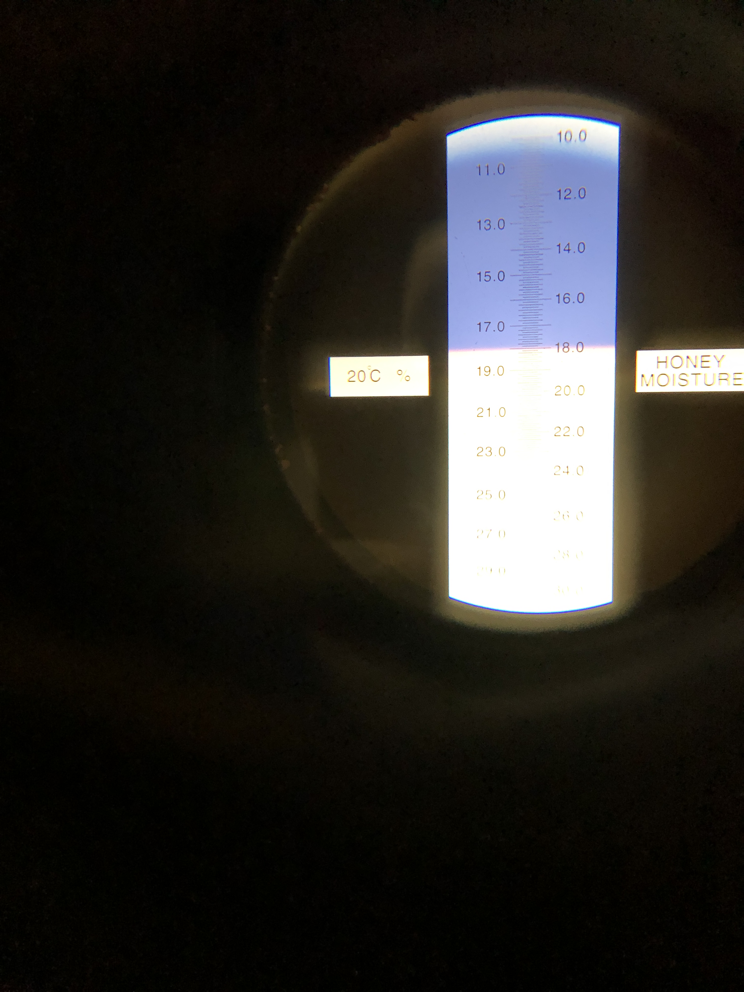 Bevor er nun in den Keller wandert um ab sofort täglich etwas gerührt zu werden, damit er schön cremig wird, habe ich noch einmal den Wassergehalt gemessen – 18%. So sieht das aus, wenn man durch das Refraktometer schaut: