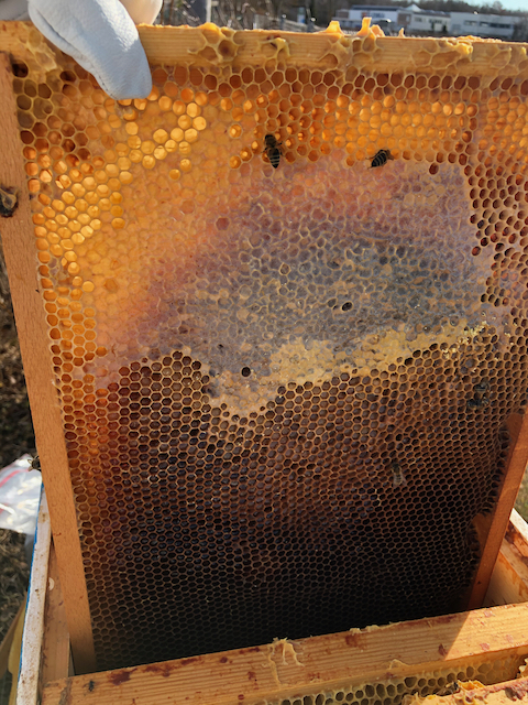 - beide Völker haben noch gute Futtervorräte, ich musste (noch) keine Notfütterung vornehmen – die vorratsverschlingende Zeit kommt aber erst noch, wenn die Völker wieder voll in die Brut gehen und noch kein Nektar verfügbar ist (oder es dann auch noch zu kalt zum Fliegen ist)