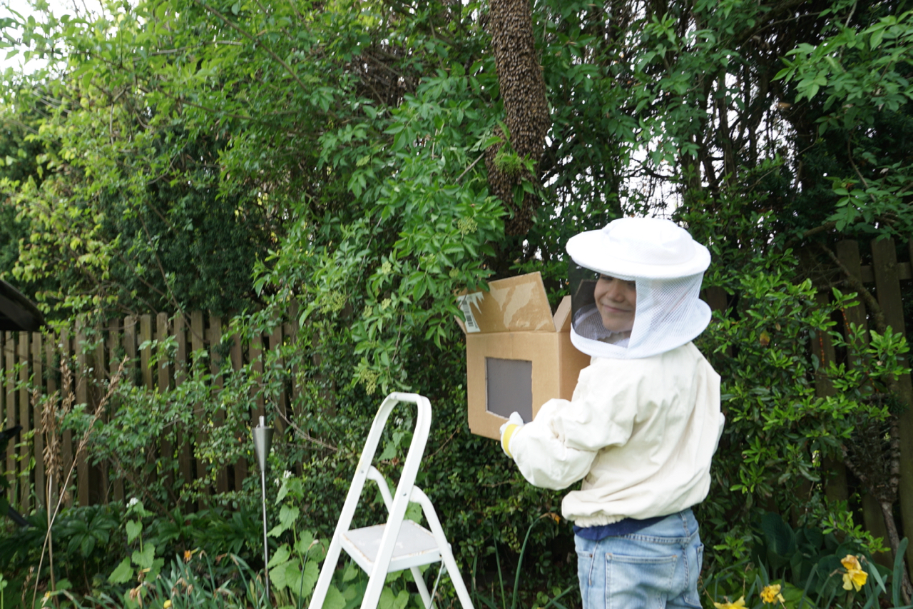 Und dann ging der Schwarmfang ganz einfach und schnell, denn unser lieber Nachbar fand die Zweige, an denen die Bienen hingen, sehr entbehrlich. Leiter aufgestellt, und die beiden Zweige gaaaanz vorsichtig mit der Gartenschere abgeschnitten, noch vorsichtiger die Leiter wieder runter damit. Meine beiden Schwarmfanghelfer standen schon mit Kamera und Sprühflasche bereit. Die Zweige wurden noch schnell auf das nötigste zurechtgestutzt und dann wurden die Bienen mit einem kräftigen Ruck über einen Trichter in die Schwarmkiste abgestoßen:
