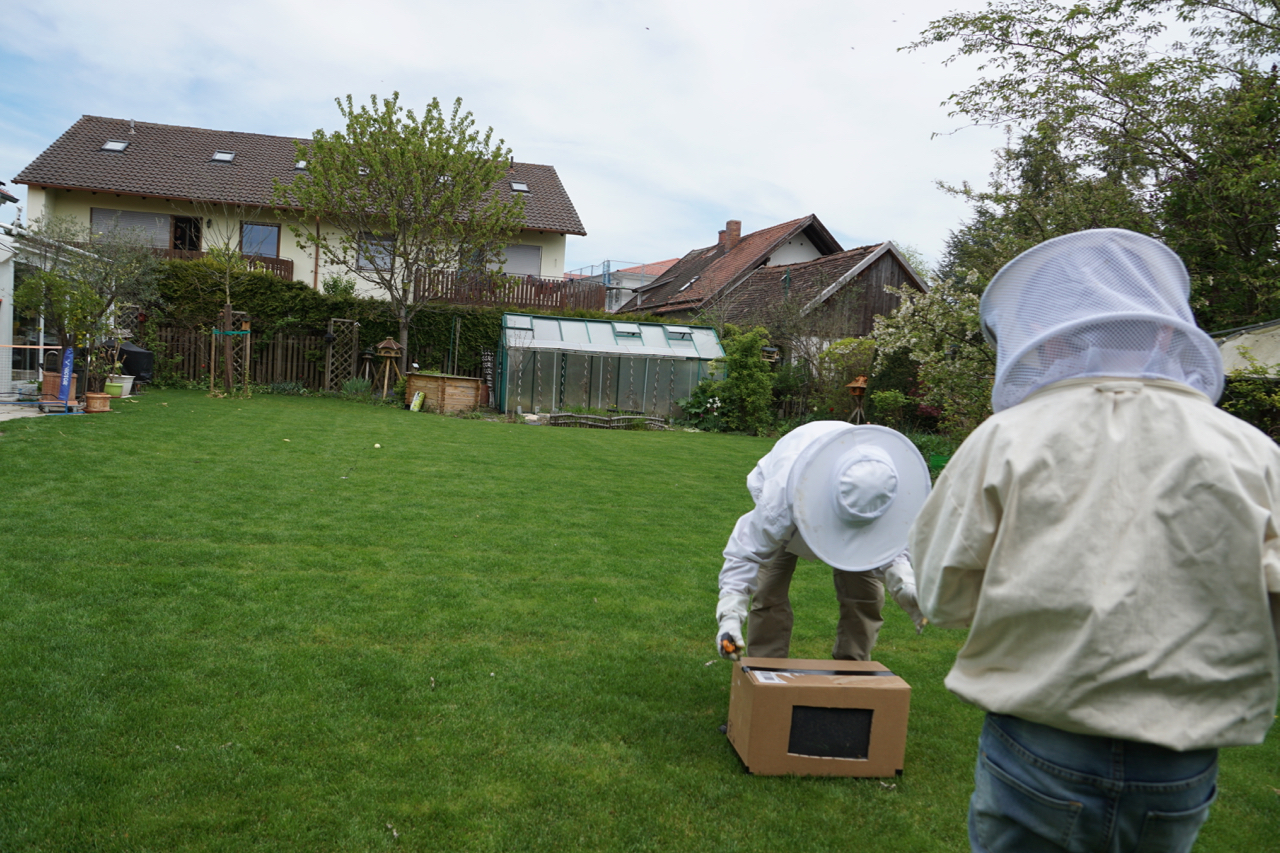 Nach zwei Tagen stellte ich die Beute dann mit offenem Flugloch vormittags auf den Balkon. Mal sehen, ob das klappt. Falls nicht hätten die Arbeiterinnen genug Futter, um sich bei ihrem alten Volk wieder einzubetteln…