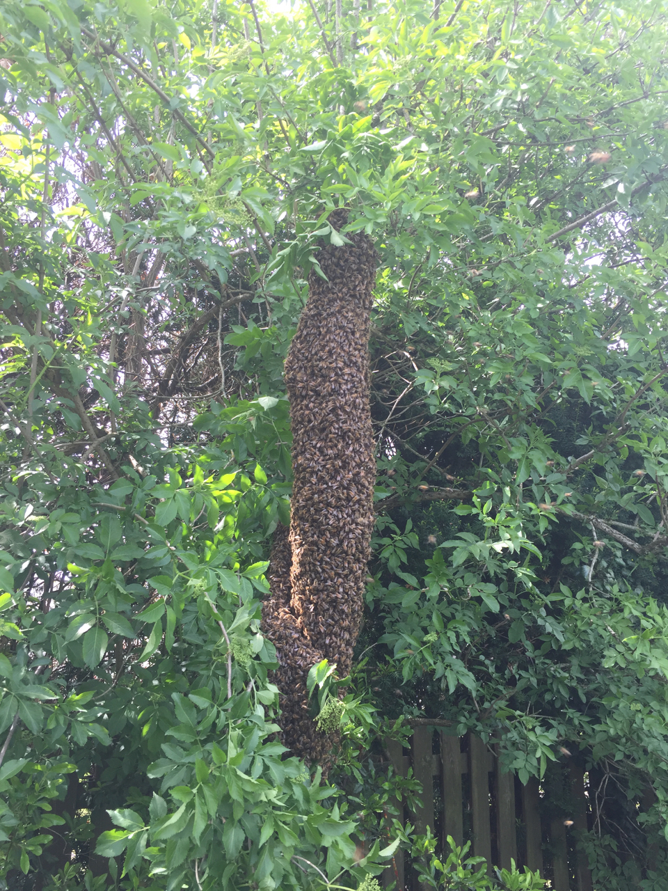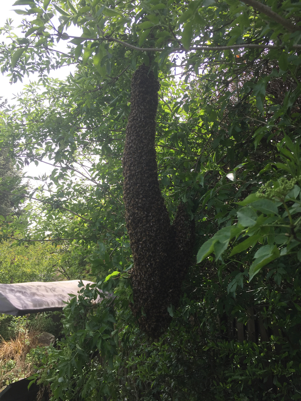 Unser Nachbar kam uns auf halbem Weg in seinen Garten schon entgegen, weil er das laute Brausen auch gehört hatte (und netterweise auch immer in der Schwarmsaison ein Auge auf unsere Beuten hat). Innerhalb kürzester Zeit konnten wir in der hohen Hecke oben im Holunder eine Stelle erkennen, an der sich die Bienen zu sammeln begannen. Und Ruckzuck hatten sie zwei schöne dicke Trauben ganz nah beieinander gebildet – hier ein paar Momentaufnahmen: