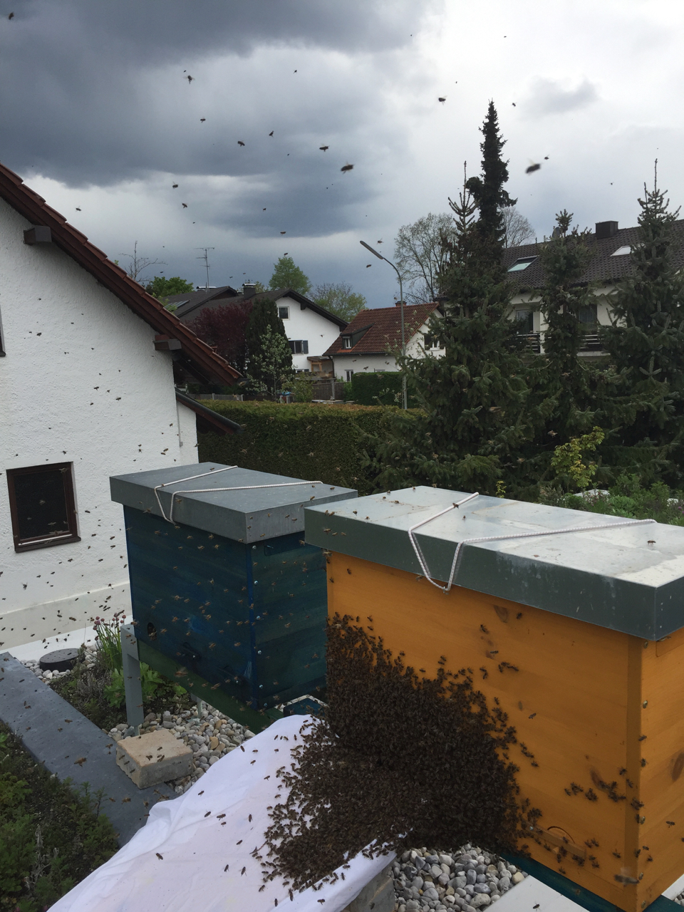 Wir sprangen in unsere Imkerjacken und hüpften auf die Garage – mitten in die Wolke. Wir konnten sehr schnell erkennen, dass sich die Wolke in Richtung Nachbargarten bewegte.