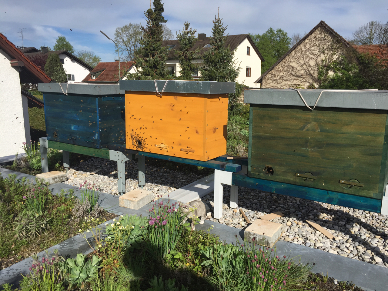 Am Donnerstag saß ich dann in einer kleiner Gartenarbeitspause bei herrlichstem Wetter auf der Garage und beobachtete das erneut immense Treiben am und ums Flugloch der grünen Beute.