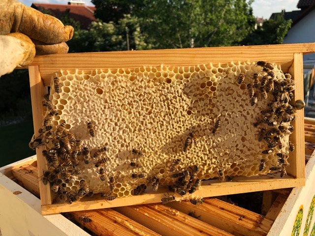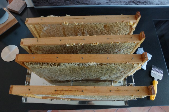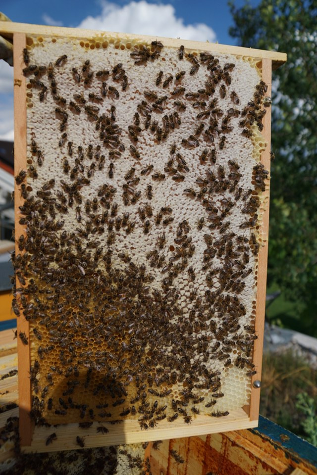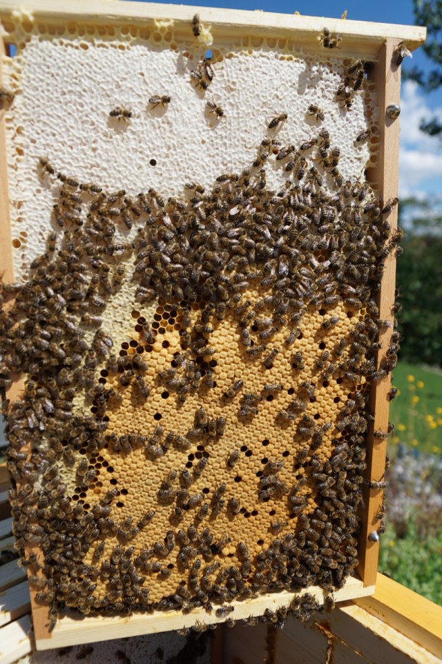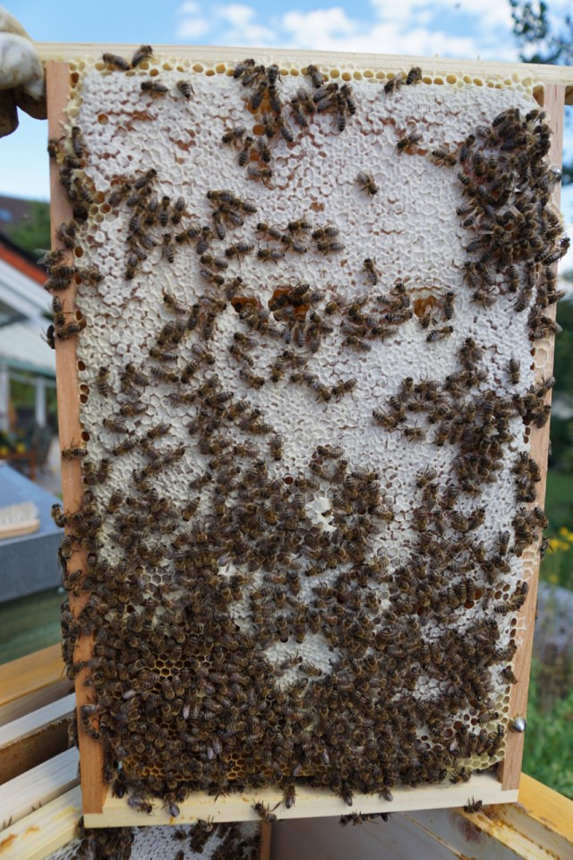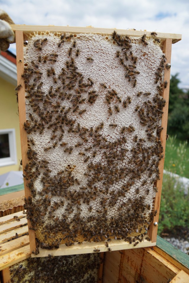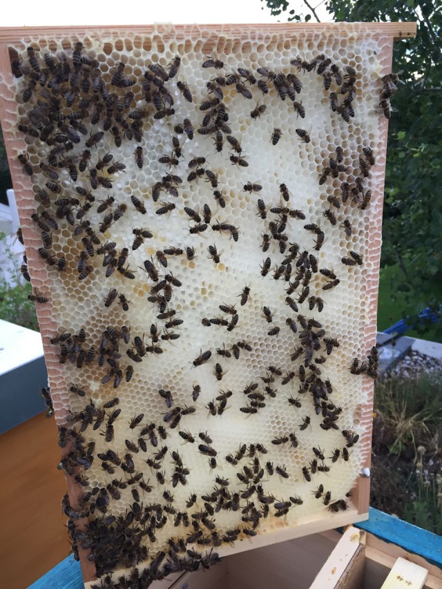 Den fand ich nämlich leider Mitte August gar nicht mehr vor, nur noch sein minimalistisches Wabenwerk, was gerade von Wachsmotten zerstört wurde. Ich gehe mal sehr stark davon aus, dass die direkten Nachbarn die Gelegenheit zum Räubern genutzt und sich an den Vorräten des sehr schwachen Ablegers bedient hatten. Es war mein erster Versuch eine Reservekönigin über den Sommer zu ziehen, und der war leider mit Pauken und Trompeten gescheitert, trotz winzig kleinen Fluglochs. Es waren auch einfach zu wenig Bienen gewesen, sie sind trotz Fütterung hinten und vorne nicht nachgekommen, entsprechend war auch der Milbendruck zu hoch im Volk gewesen. 😦 Ist mir eine traurige Lehre fürs nächste Mal.