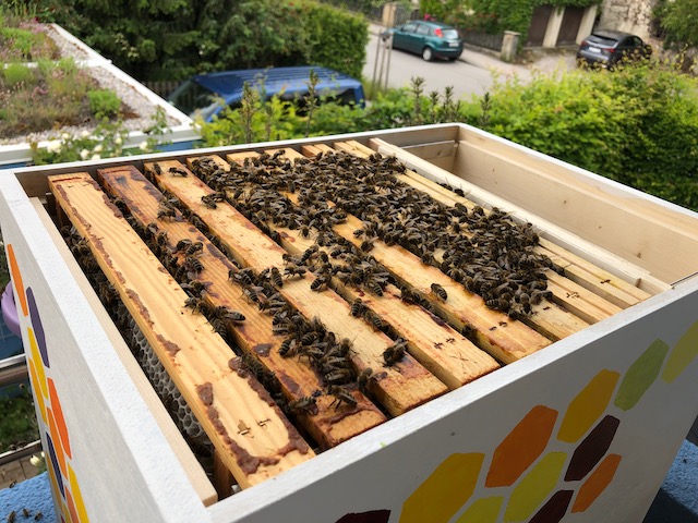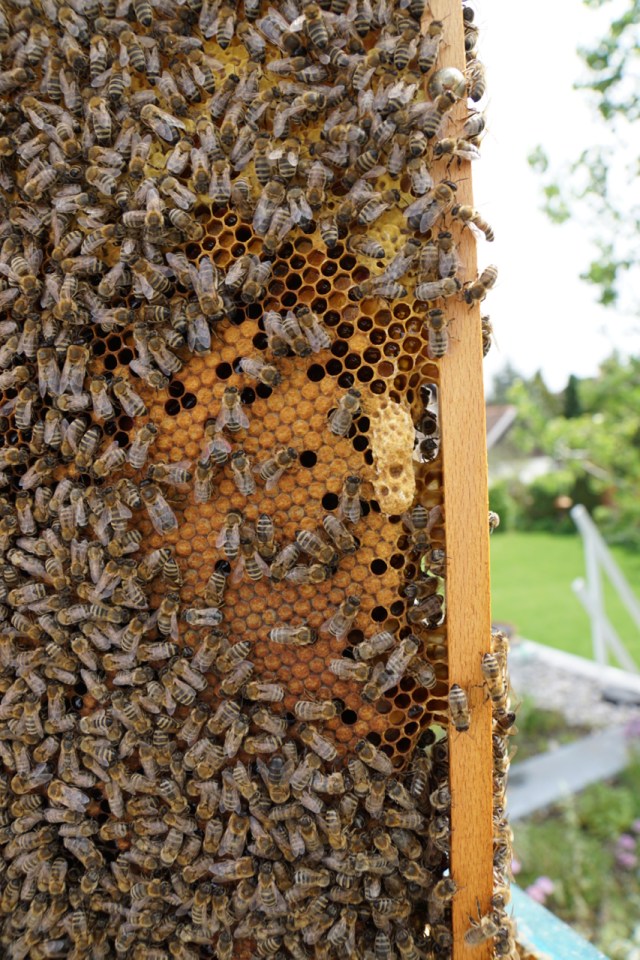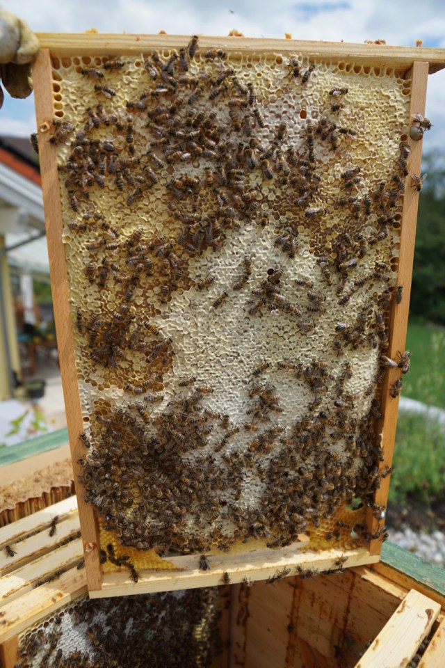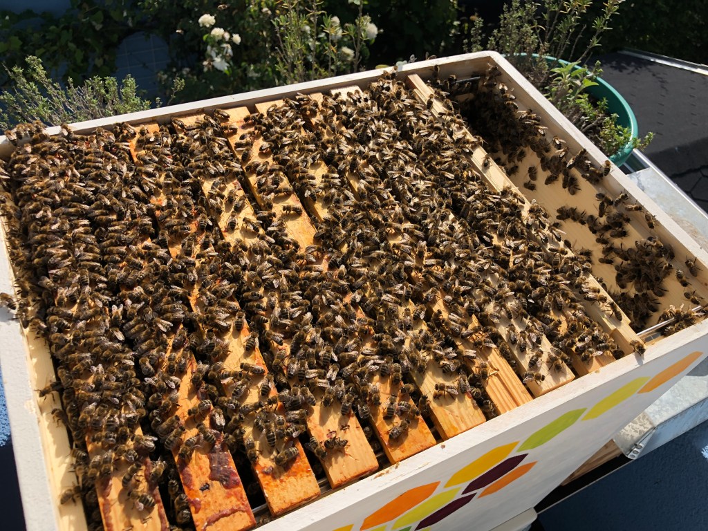 Unser neues Volk in der Pollenbeute auf dem Balkon hat sich äußerst prächtig entwickelt, das Brutnest war seit dem Umzug in die richtige Beute wieder schön geschlossen. Leidtragende dieser guten Entwicklung waren die Nachbarn – unser winzig kleiner Ableger daneben.