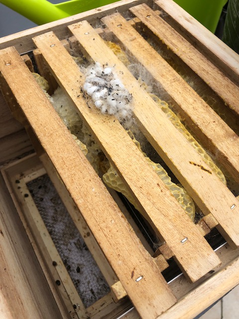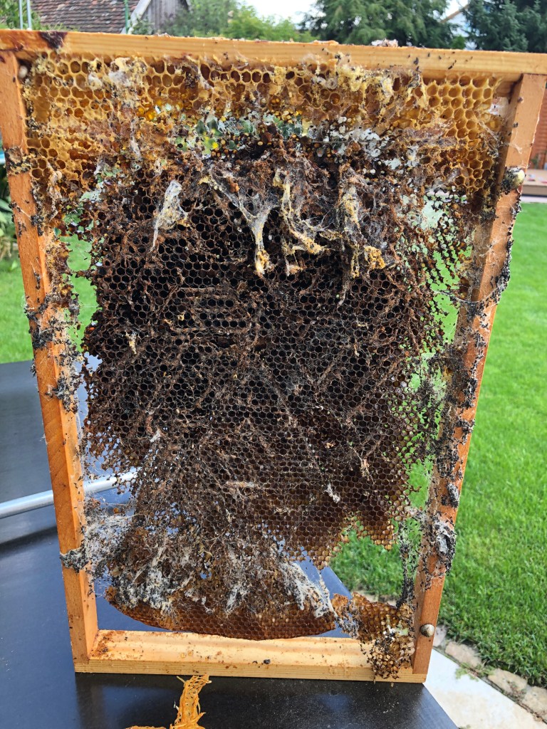 Ein weiteres Malheur, was mir auch nicht mehr passieren wird – Wachsmotten in den Reservewaben! Im Lauf der Zeit hatten sich so einige Waben angesammelt, die ich in luftdichten Kunststoffboxen aufbewahre. Darunter sind auch immer wieder leere, bebrütete Waben. Eigentlich packe ich alle Rähmchen ausnahmslos 48h in die Gefriertruhe, um potentiell vorhandene Wachsmottenlarven oder Eier abzutöten. Aaaaaber – wir haben ja gerade Pandemie, und unsere Gefriertruhe, in die die Riesen-Einraumbeutenrähmchen reinpassen (wenn ich drei (!) ganze Fächer leer räume), war leider rappelvoll. Und so viel Platz konnten wir unmöglich innerhalb weniger Tage leer futtern, auch nicht in der Grillhochsaison. Also habe ich die Waben sehr gründlich (ja, mit Brille und Taschenlampe) kontrolliert, bevor ich sie in die leere Transportkiste gestellt habe, die eigentlich mottendicht ist. Die Kiste habe ich dann extra im Wohnzimmer stehen lassen, und alle paar Tagen ein paar Waben gezogen und kontrolliert. Auch nach 3 Wochen alles bestens. Stück für Stück wanderte die Kiste mehr in eine Ecke. Und dann auf einmal, Wochen später hörte ich beim gemeinsamen Familienfernsehen so ein komisches knisterndes Geräusch. Wir dachten erst alle, es käme vom frisch eingeschlichteten Brennholz am Kachelofen. Am nächsten Abend war das Knistern wieder da, und dieses Mal konnten wir das Geräusch besser orten – es kam aus der Transportkiste mit den Waben drin! Oh nein! Was soll ich sagen, ich fand in der Kiste die reinste Wachsmottenzucht vor. Pfui deifi! In den Gespinsten waberte es nur so vor dicken, fetten Maden. Echt gruselig! Ich habe nur am nächsten Tag ein Bild gemacht, aber auf dem ist das Ausmaß der Verwüstung nur begrenzt zu erkennen – man stelle sich pro Wabe noch ein paar hundert Maden vor.