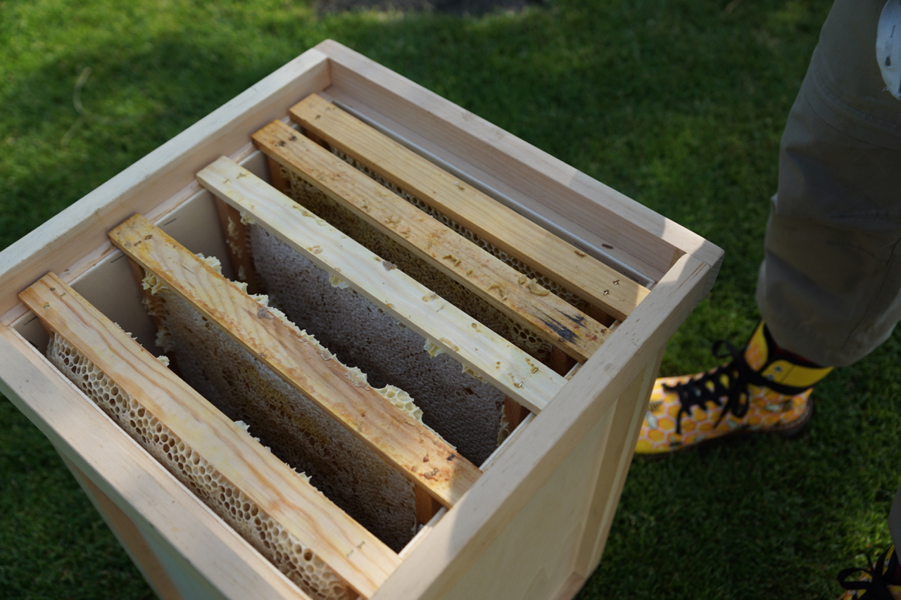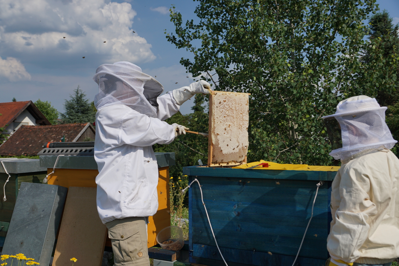 Heute war es soweit, wir durften unseren ersten eigenen Honig ernten. Dank der tollen Sammelleistung unserer Bienen konnten wir insgesamt 9 Futterwaben entnehmen. Besonders erfreulich war dabei, dass sogar der Schwarm in der gelben Kiste mit Königin Diana schon so viel gebaut und eingelagert hatte, dass wir auch hier ein Rähmchen stibitzen konnten!