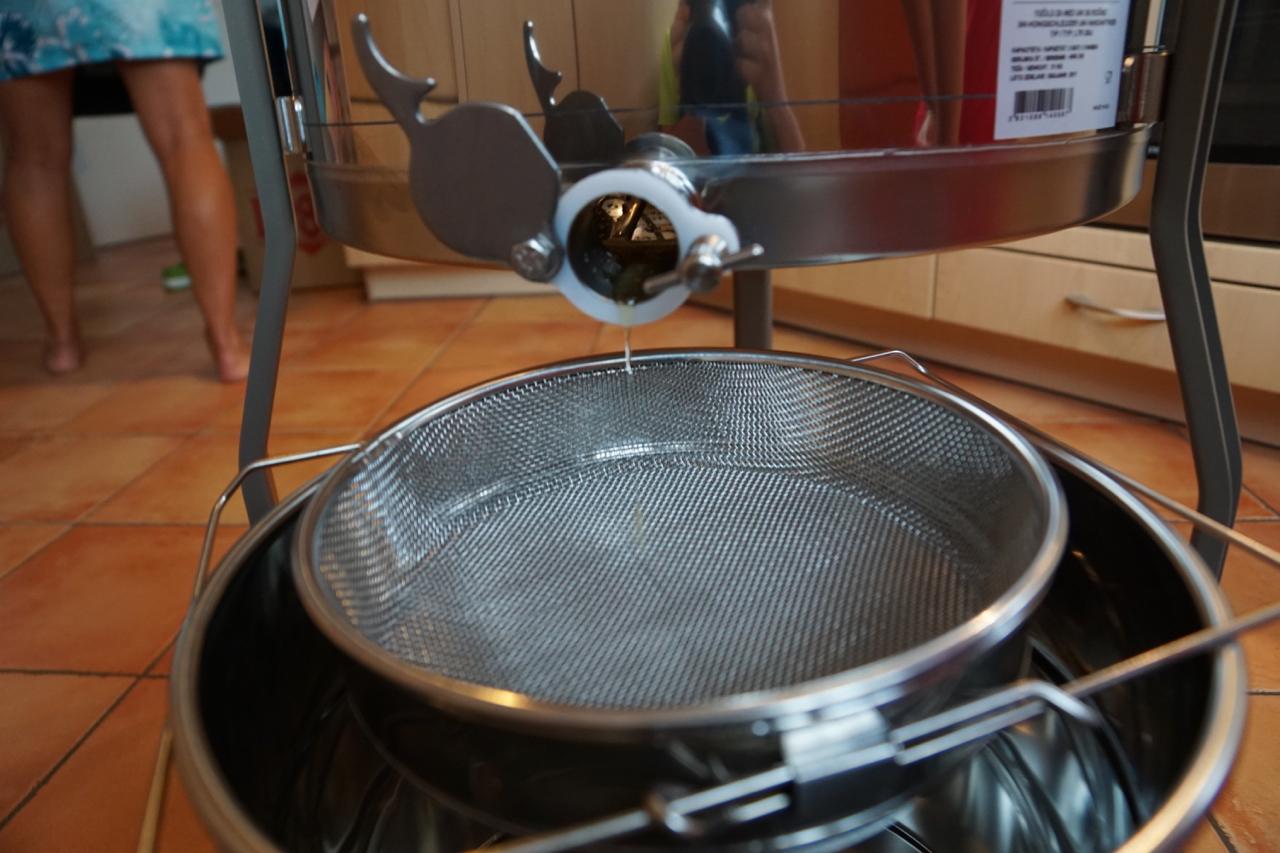 Wir haben den Honig durch ein Doppelsieb laufen lassen, und anschließend noch einmal durch ein extrafeines Honigfiltertuch. Am Ende war dann ein großer Hobbock (so heißen diese Honigeimer) mehr als halb voll – und wir restlos begeistert. Allerdings musste Tobis und mein Abendessen auch bis halb elf warten, damit der Honig den Essensgeruch nicht annahm… Manchmal muss man halt Opfer bringen! 😉
