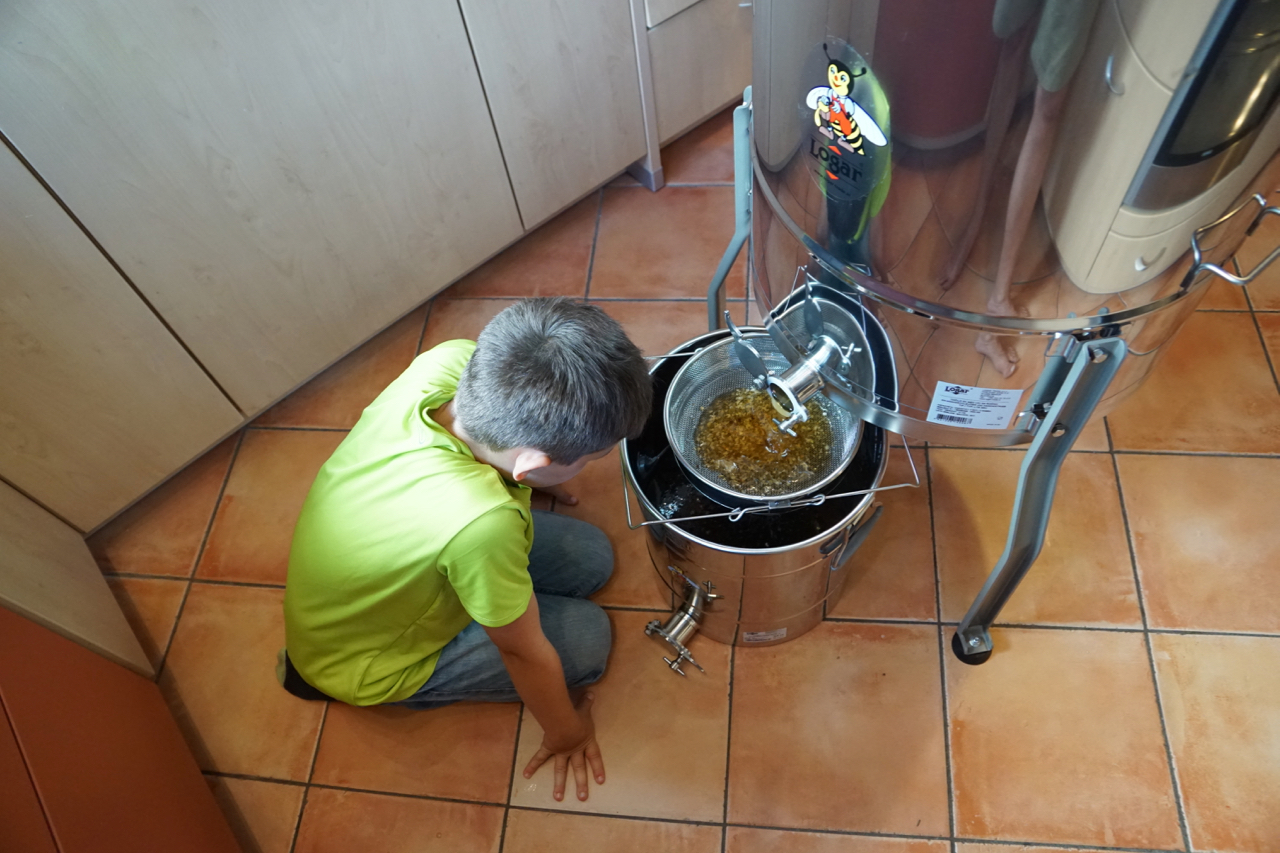 Meine zwei Mini-Imker waren auch wieder fleissig mit dabei, als endlich der schon etwas ersehnte Moment da war, dem das langwierige Auspacken, Zusammenbauen und Reinigen der Schleuder und Zubehör vorangegangen war: